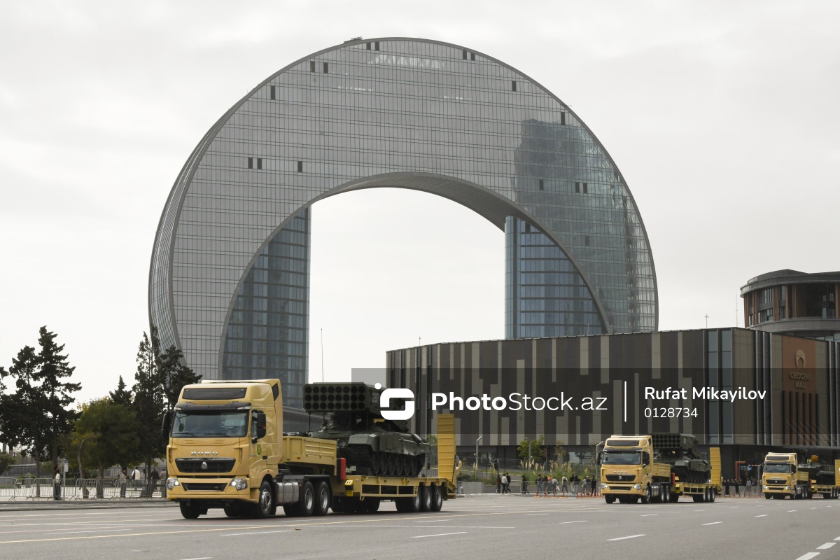 Bakıda Zəfər Gününün beşinci ildönümü münasibətilə təşkil olunan hərbi paradın məşq prosesində nümayiş olunan TOS-1A “Solntsepyok” ağır odsaçan sistem.