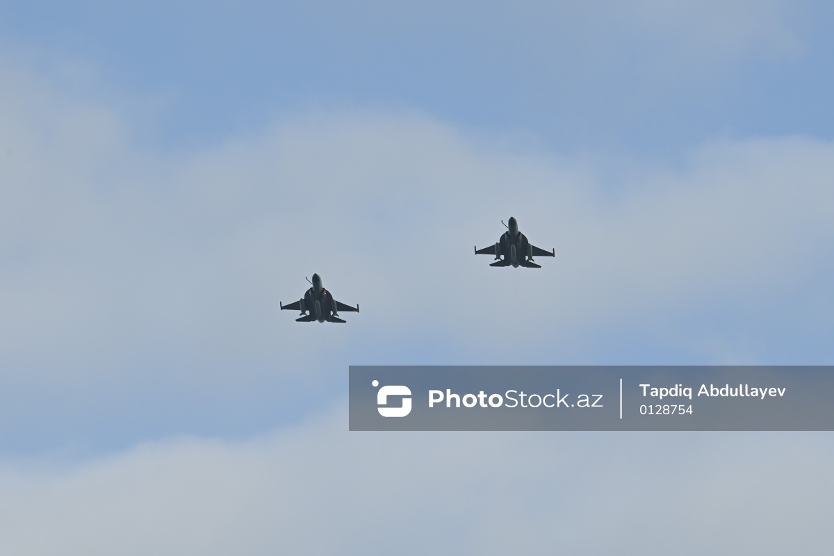 Bakıda Zəfər Gününün beşinci ildönümü münasibətilə təşkil olunan hərbi paradın məşq prosesində nümayiş olunan "F-16" qırıcı təyyarəsi.