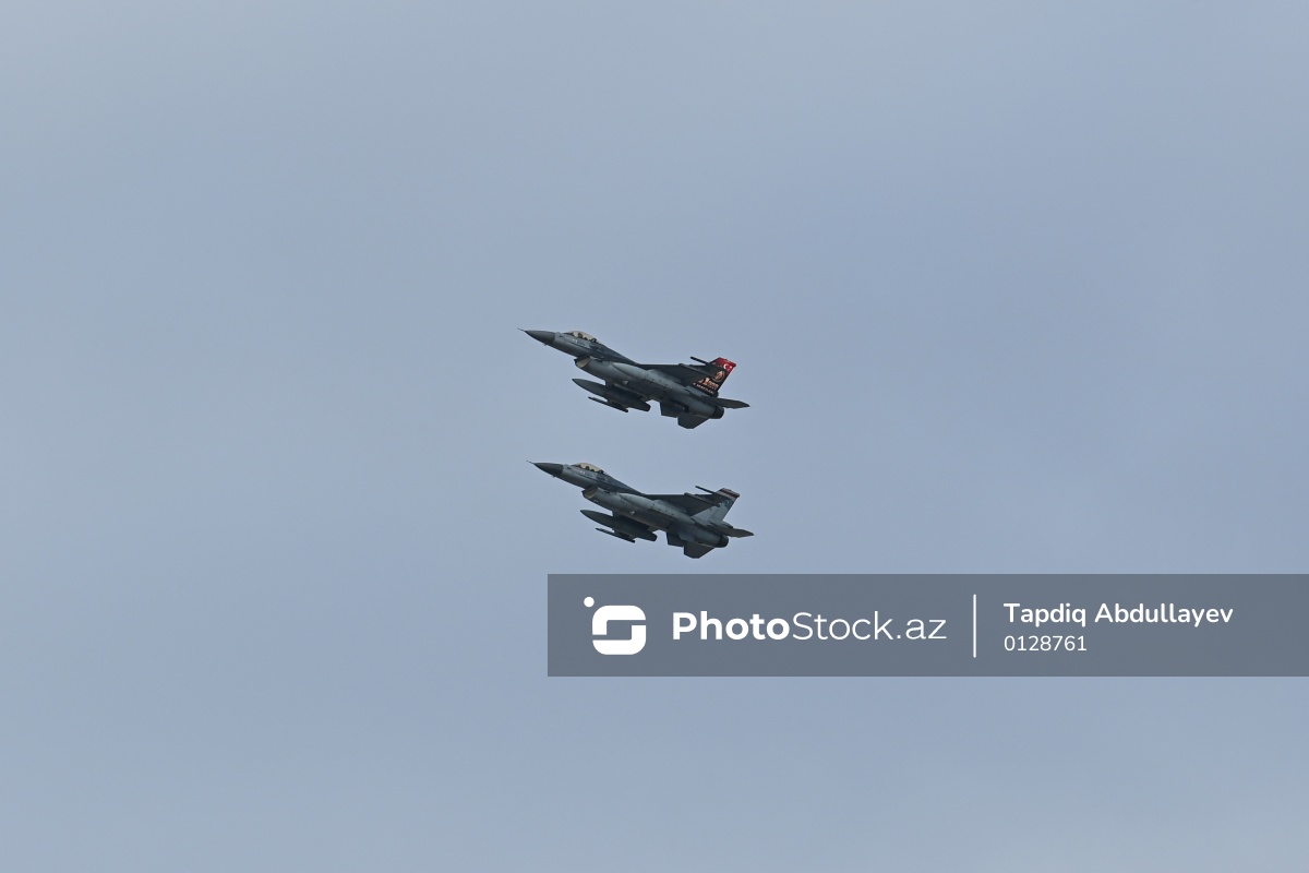Bakıda Zəfər Gününün beşinci ildönümü münasibətilə təşkil olunan hərbi paradın məşq prosesində nümayiş olunan "F-16" qırıcı təyyarəsi.