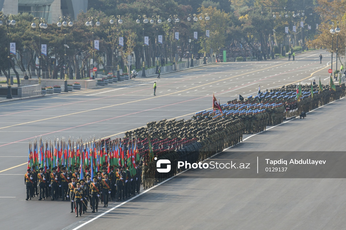 Noyabrın 8-də Bakının Azadlıq meydanında Vətən müharibəsində qələbənin beşinci ildönümünə həsr olunmuş hərbi parad keçirilib. Azərbaycan Respublikasının Prezidenti İlham Əliyev, birinci xanım Mehriban Əliyeva, Türkiyə Respublikasının Prezidenti Rəcəb Tayyib Ərdoğan, Pakistan İslam Respublikasının Baş naziri Məhəmməd Şahbaz Şərif paradda iştirak ediblər. Azərbaycanın, Türkiyənin və Pakistanın Dövlət himnləri səsləndirilib. Ümummilli Lider Heydər Əliyevin və qəhrəman şəhidlərimizin xatirəsi 1 dəqiqəlik sükutla yad olunub. Müdafiə naziri general-polkovnik Zakir Həsənov Azərbaycan Prezidenti, Silahlı Qüvvələrin Müzəffər Ali Baş Komandanı İlham Əliyevə raport verib. Paradda Azərbaycan Respublikasının Prezidenti İlham Əliyev, Türkiyə Respublikasının Prezidenti Rəcəb Tayyib Ərdoğan və Pakistan İslam Respublikasının Baş naziri Məhəmməd Şahbaz Şərif çıxış edib. Daha sonra Silahlı Qüvvələrin şəxsi heyətinin və hərbi texnikanın təntənəli keçidi başlayıb. Hərbi Dəniz Qüvvələrinin və Dövlət Sərhəd Xidməti Sahil Mühafizəsinin döyüş gəmiləri və katerləri Xəzər dənizinin sahil sularında yüksək döyüş hazırlığı nümayiş etdirib. Bundan sonra Azadlıq meydanı üzərində Azərbaycan və Türkiyə pilotlarının iştirakı ilə Hərbi Hava Qüvvələrinə məxsus döyüş təyyarələrinin və helikopterlərin uçuşu olub.