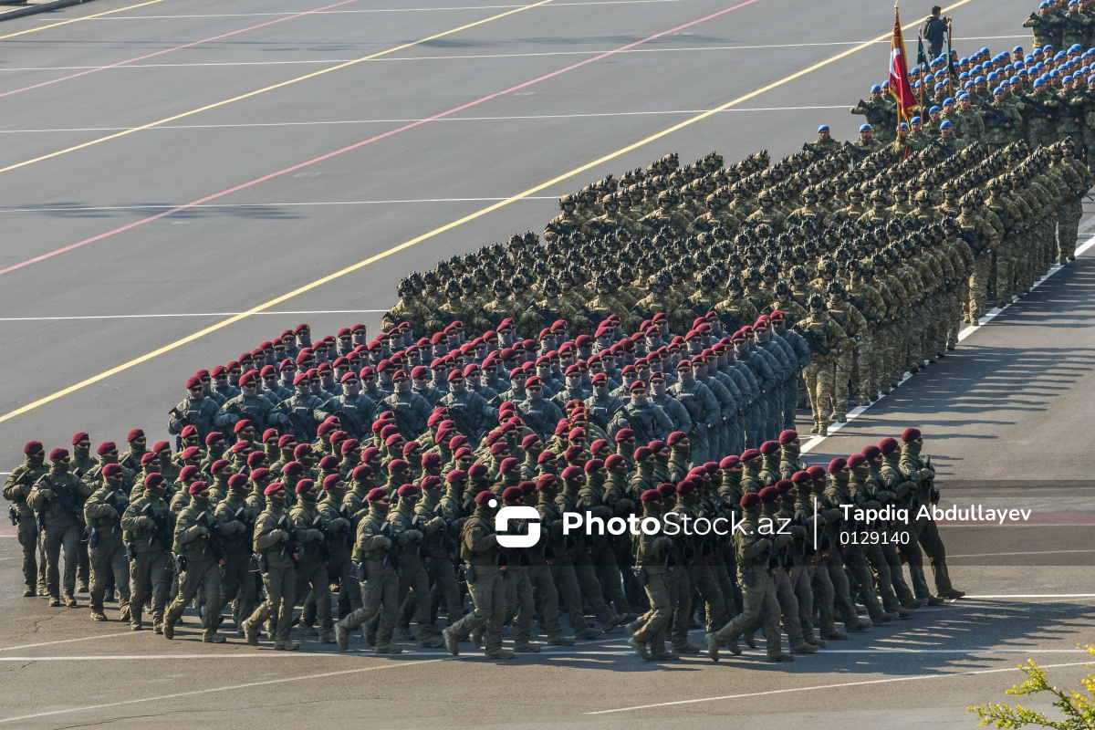 Noyabrın 8-də Bakının Azadlıq meydanında Vətən müharibəsində qələbənin beşinci ildönümünə həsr olunmuş hərbi parad keçirilib. Azərbaycan Respublikasının Prezidenti İlham Əliyev, birinci xanım Mehriban Əliyeva, Türkiyə Respublikasının Prezidenti Rəcəb Tayyib Ərdoğan, Pakistan İslam Respublikasının Baş naziri Məhəmməd Şahbaz Şərif paradda iştirak ediblər. Azərbaycanın, Türkiyənin və Pakistanın Dövlət himnləri səsləndirilib. Ümummilli Lider Heydər Əliyevin və qəhrəman şəhidlərimizin xatirəsi 1 dəqiqəlik sükutla yad olunub. Müdafiə naziri general-polkovnik Zakir Həsənov Azərbaycan Prezidenti, Silahlı Qüvvələrin Müzəffər Ali Baş Komandanı İlham Əliyevə raport verib. Paradda Azərbaycan Respublikasının Prezidenti İlham Əliyev, Türkiyə Respublikasının Prezidenti Rəcəb Tayyib Ərdoğan və Pakistan İslam Respublikasının Baş naziri Məhəmməd Şahbaz Şərif çıxış edib. Daha sonra Silahlı Qüvvələrin şəxsi heyətinin və hərbi texnikanın təntənəli keçidi başlayıb. Hərbi Dəniz Qüvvələrinin və Dövlət Sərhəd Xidməti Sahil Mühafizəsinin döyüş gəmiləri və katerləri Xəzər dənizinin sahil sularında yüksək döyüş hazırlığı nümayiş etdirib. Bundan sonra Azadlıq meydanı üzərində Azərbaycan və Türkiyə pilotlarının iştirakı ilə Hərbi Hava Qüvvələrinə məxsus döyüş təyyarələrinin və helikopterlərin uçuşu olub.