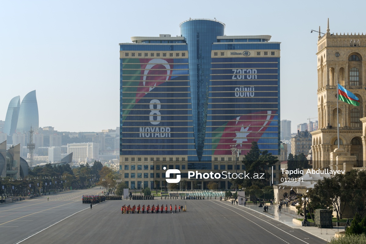 Noyabrın 8-də Bakının Azadlıq meydanında Vətən müharibəsində qələbənin beşinci ildönümünə həsr olunmuş hərbi parad keçirilib. Azərbaycan Respublikasının Prezidenti İlham Əliyev, birinci xanım Mehriban Əliyeva, Türkiyə Respublikasının Prezidenti Rəcəb Tayyib Ərdoğan, Pakistan İslam Respublikasının Baş naziri Məhəmməd Şahbaz Şərif paradda iştirak ediblər. Azərbaycanın, Türkiyənin və Pakistanın Dövlət himnləri səsləndirilib. Ümummilli Lider Heydər Əliyevin və qəhrəman şəhidlərimizin xatirəsi 1 dəqiqəlik sükutla yad olunub. Müdafiə naziri general-polkovnik Zakir Həsənov Azərbaycan Prezidenti, Silahlı Qüvvələrin Müzəffər Ali Baş Komandanı İlham Əliyevə raport verib. Paradda Azərbaycan Respublikasının Prezidenti İlham Əliyev, Türkiyə Respublikasının Prezidenti Rəcəb Tayyib Ərdoğan və Pakistan İslam Respublikasının Baş naziri Məhəmməd Şahbaz Şərif çıxış edib. Daha sonra Silahlı Qüvvələrin şəxsi heyətinin və hərbi texnikanın təntənəli keçidi başlayıb. Hərbi Dəniz Qüvvələrinin və Dövlət Sərhəd Xidməti Sahil Mühafizəsinin döyüş gəmiləri və katerləri Xəzər dənizinin sahil sularında yüksək döyüş hazırlığı nümayiş etdirib. Bundan sonra Azadlıq meydanı üzərində Azərbaycan və Türkiyə pilotlarının iştirakı ilə Hərbi Hava Qüvvələrinə məxsus döyüş təyyarələrinin və helikopterlərin uçuşu olub.