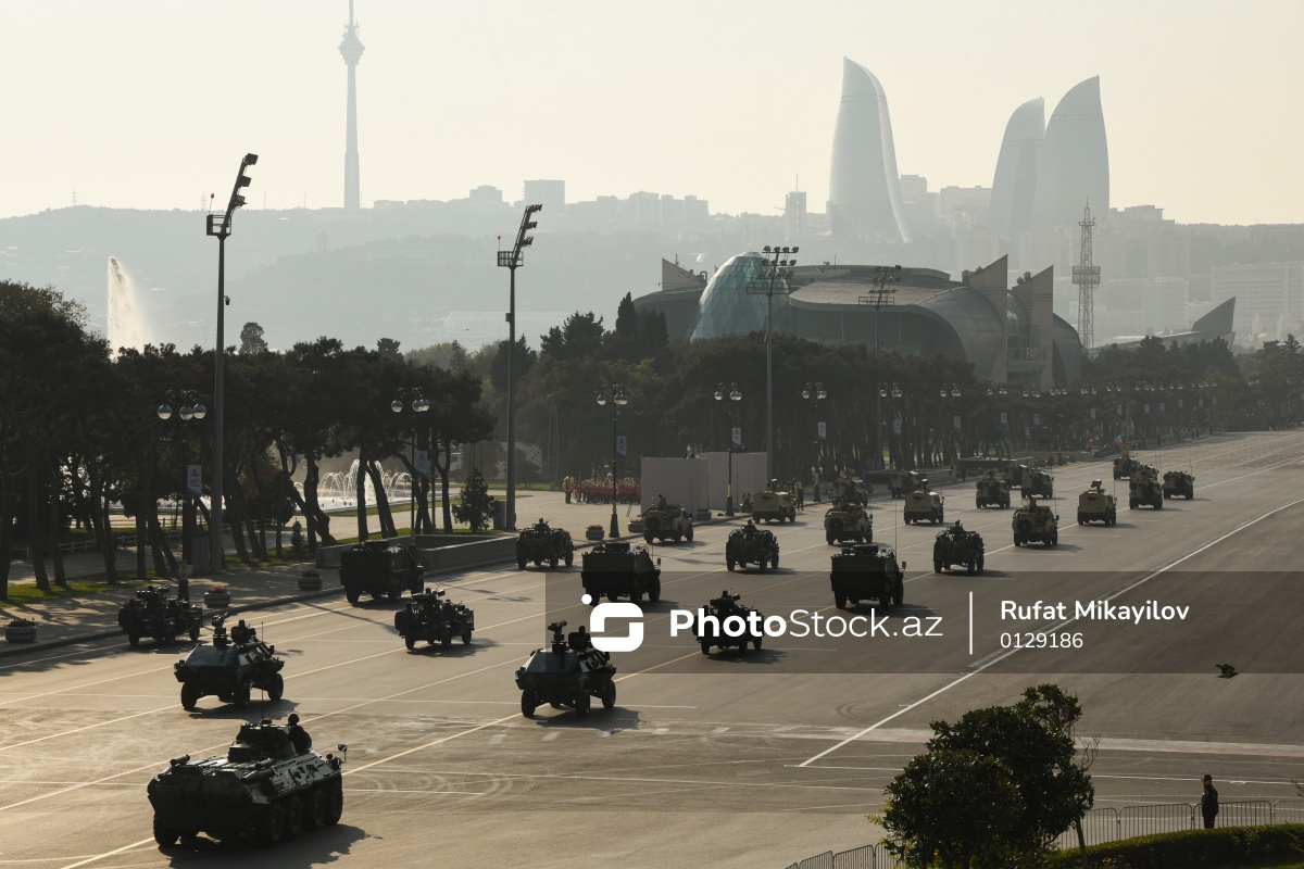 Noyabrın 8-də Bakının Azadlıq meydanında Vətən müharibəsində qələbənin beşinci ildönümünə həsr olunmuş hərbi parad keçirilib. Azərbaycan Respublikasının Prezidenti İlham Əliyev, birinci xanım Mehriban Əliyeva, Türkiyə Respublikasının Prezidenti Rəcəb Tayyib Ərdoğan, Pakistan İslam Respublikasının Baş naziri Məhəmməd Şahbaz Şərif paradda iştirak ediblər. Azərbaycanın, Türkiyənin və Pakistanın Dövlət himnləri səsləndirilib. Ümummilli Lider Heydər Əliyevin və qəhrəman şəhidlərimizin xatirəsi 1 dəqiqəlik sükutla yad olunub. Müdafiə naziri general-polkovnik Zakir Həsənov Azərbaycan Prezidenti, Silahlı Qüvvələrin Müzəffər Ali Baş Komandanı İlham Əliyevə raport verib. Paradda Azərbaycan Respublikasının Prezidenti İlham Əliyev, Türkiyə Respublikasının Prezidenti Rəcəb Tayyib Ərdoğan və Pakistan İslam Respublikasının Baş naziri Məhəmməd Şahbaz Şərif çıxış edib. Daha sonra Silahlı Qüvvələrin şəxsi heyətinin və hərbi texnikanın təntənəli keçidi başlayıb. Hərbi Dəniz Qüvvələrinin və Dövlət Sərhəd Xidməti Sahil Mühafizəsinin döyüş gəmiləri və katerləri Xəzər dənizinin sahil sularında yüksək döyüş hazırlığı nümayiş etdirib. Bundan sonra Azadlıq meydanı üzərində Azərbaycan və Türkiyə pilotlarının iştirakı ilə Hərbi Hava Qüvvələrinə məxsus döyüş təyyarələrinin və helikopterlərin uçuşu olub.