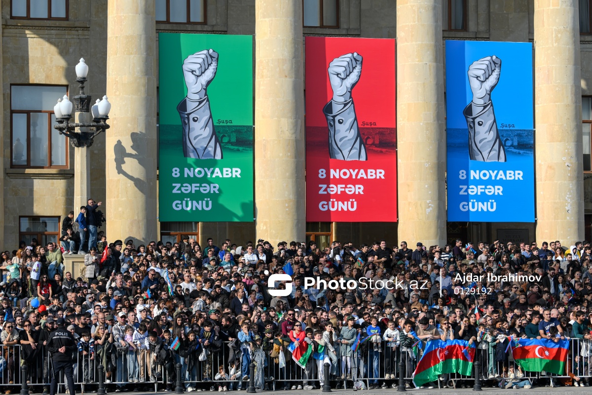 Noyabrın 8-də Bakının Azadlıq meydanında Vətən müharibəsində qələbənin beşinci ildönümünə həsr olunmuş hərbi parad keçirilib. Azərbaycan Respublikasının Prezidenti İlham Əliyev, birinci xanım Mehriban Əliyeva, Türkiyə Respublikasının Prezidenti Rəcəb Tayyib Ərdoğan, Pakistan İslam Respublikasının Baş naziri Məhəmməd Şahbaz Şərif paradda iştirak ediblər. Azərbaycanın, Türkiyənin və Pakistanın Dövlət himnləri səsləndirilib. Ümummilli Lider Heydər Əliyevin və qəhrəman şəhidlərimizin xatirəsi 1 dəqiqəlik sükutla yad olunub. Müdafiə naziri general-polkovnik Zakir Həsənov Azərbaycan Prezidenti, Silahlı Qüvvələrin Müzəffər Ali Baş Komandanı İlham Əliyevə raport verib. Paradda Azərbaycan Respublikasının Prezidenti İlham Əliyev, Türkiyə Respublikasının Prezidenti Rəcəb Tayyib Ərdoğan və Pakistan İslam Respublikasının Baş naziri Məhəmməd Şahbaz Şərif çıxış edib. Daha sonra Silahlı Qüvvələrin şəxsi heyətinin və hərbi texnikanın təntənəli keçidi başlayıb. Hərbi Dəniz Qüvvələrinin və Dövlət Sərhəd Xidməti Sahil Mühafizəsinin döyüş gəmiləri və katerləri Xəzər dənizinin sahil sularında yüksək döyüş hazırlığı nümayiş etdirib. Bundan sonra Azadlıq meydanı üzərində Azərbaycan və Türkiyə pilotlarının iştirakı ilə Hərbi Hava Qüvvələrinə məxsus döyüş təyyarələrinin və helikopterlərin uçuşu olub.