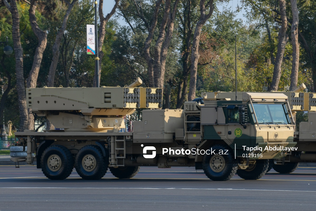 Bakıda keçirilən hərbi paradda nümayiş olunan 122 millimetrlik “ACCULAR” (AKULAR) idarə olunan yaylım atəşli reaktiv sistemi.