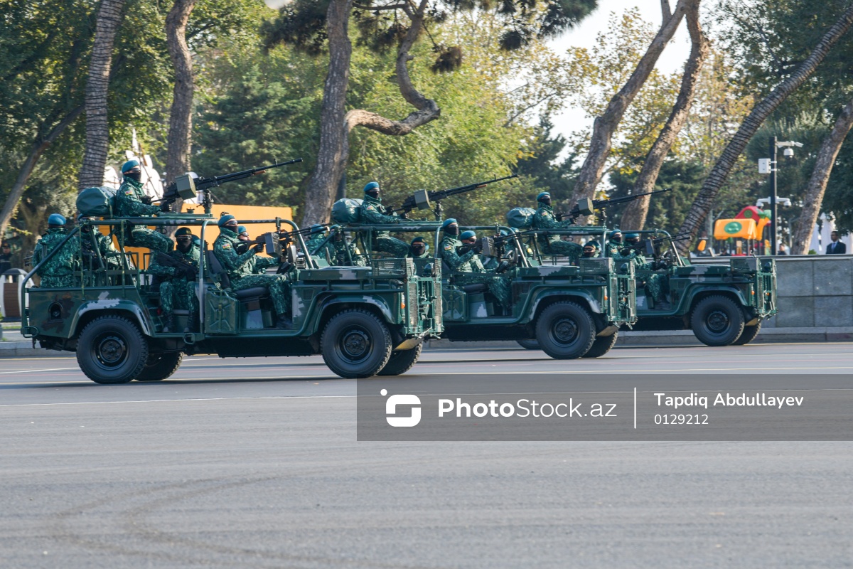 Noyabrın 8-də Bakının Azadlıq meydanında Vətən müharibəsində qələbənin beşinci ildönümünə həsr olunmuş hərbi parad keçirilib. Azərbaycan Respublikasının Prezidenti İlham Əliyev, birinci xanım Mehriban Əliyeva, Türkiyə Respublikasının Prezidenti Rəcəb Tayyib Ərdoğan, Pakistan İslam Respublikasının Baş naziri Məhəmməd Şahbaz Şərif paradda iştirak ediblər. Azərbaycanın, Türkiyənin və Pakistanın Dövlət himnləri səsləndirilib. Ümummilli Lider Heydər Əliyevin və qəhrəman şəhidlərimizin xatirəsi 1 dəqiqəlik sükutla yad olunub. Müdafiə naziri general-polkovnik Zakir Həsənov Azərbaycan Prezidenti, Silahlı Qüvvələrin Müzəffər Ali Baş Komandanı İlham Əliyevə raport verib. Paradda Azərbaycan Respublikasının Prezidenti İlham Əliyev, Türkiyə Respublikasının Prezidenti Rəcəb Tayyib Ərdoğan və Pakistan İslam Respublikasının Baş naziri Məhəmməd Şahbaz Şərif çıxış edib. Daha sonra Silahlı Qüvvələrin şəxsi heyətinin və hərbi texnikanın təntənəli keçidi başlayıb. Hərbi Dəniz Qüvvələrinin və Dövlət Sərhəd Xidməti Sahil Mühafizəsinin döyüş gəmiləri və katerləri Xəzər dənizinin sahil sularında yüksək döyüş hazırlığı nümayiş etdirib. Bundan sonra Azadlıq meydanı üzərində Azərbaycan və Türkiyə pilotlarının iştirakı ilə Hərbi Hava Qüvvələrinə məxsus döyüş təyyarələrinin və helikopterlərin uçuşu olub.