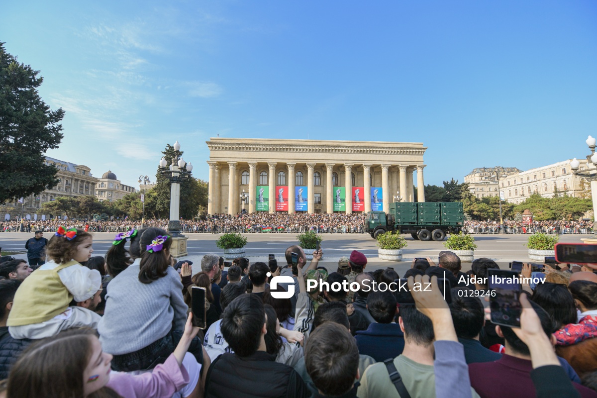 Noyabrın 8-də Bakının Azadlıq meydanında Vətən müharibəsində qələbənin beşinci ildönümünə həsr olunmuş hərbi parad keçirilib. Azərbaycan Respublikasının Prezidenti İlham Əliyev, birinci xanım Mehriban Əliyeva, Türkiyə Respublikasının Prezidenti Rəcəb Tayyib Ərdoğan, Pakistan İslam Respublikasının Baş naziri Məhəmməd Şahbaz Şərif paradda iştirak ediblər. Azərbaycanın, Türkiyənin və Pakistanın Dövlət himnləri səsləndirilib. Ümummilli Lider Heydər Əliyevin və qəhrəman şəhidlərimizin xatirəsi 1 dəqiqəlik sükutla yad olunub. Müdafiə naziri general-polkovnik Zakir Həsənov Azərbaycan Prezidenti, Silahlı Qüvvələrin Müzəffər Ali Baş Komandanı İlham Əliyevə raport verib. Paradda Azərbaycan Respublikasının Prezidenti İlham Əliyev, Türkiyə Respublikasının Prezidenti Rəcəb Tayyib Ərdoğan və Pakistan İslam Respublikasının Baş naziri Məhəmməd Şahbaz Şərif çıxış edib. Daha sonra Silahlı Qüvvələrin şəxsi heyətinin və hərbi texnikanın təntənəli keçidi başlayıb. Hərbi Dəniz Qüvvələrinin və Dövlət Sərhəd Xidməti Sahil Mühafizəsinin döyüş gəmiləri və katerləri Xəzər dənizinin sahil sularında yüksək döyüş hazırlığı nümayiş etdirib. Bundan sonra Azadlıq meydanı üzərində Azərbaycan və Türkiyə pilotlarının iştirakı ilə Hərbi Hava Qüvvələrinə məxsus döyüş təyyarələrinin və helikopterlərin uçuşu olub.