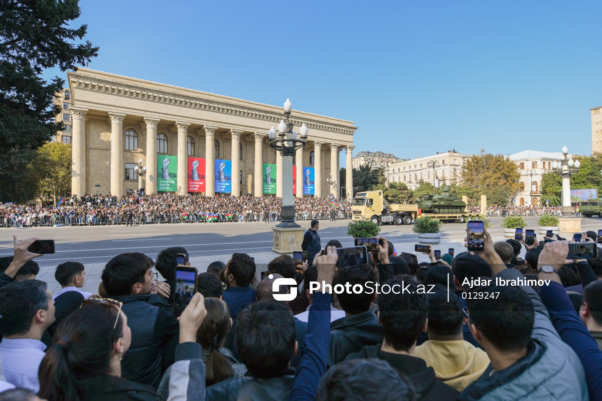 Noyabrın 8-də Bakının Azadlıq meydanında Vətən müharibəsində qələbənin beşinci ildönümünə həsr olunmuş hərbi parad keçirilib. Azərbaycan Respublikasının Prezidenti İlham Əliyev, birinci xanım Mehriban Əliyeva, Türkiyə Respublikasının Prezidenti Rəcəb Tayyib Ərdoğan, Pakistan İslam Respublikasının Baş naziri Məhəmməd Şahbaz Şərif paradda iştirak ediblər. Azərbaycanın, Türkiyənin və Pakistanın Dövlət himnləri səsləndirilib. Ümummilli Lider Heydər Əliyevin və qəhrəman şəhidlərimizin xatirəsi 1 dəqiqəlik sükutla yad olunub. Müdafiə naziri general-polkovnik Zakir Həsənov Azərbaycan Prezidenti, Silahlı Qüvvələrin Müzəffər Ali Baş Komandanı İlham Əliyevə raport verib. Paradda Azərbaycan Respublikasının Prezidenti İlham Əliyev, Türkiyə Respublikasının Prezidenti Rəcəb Tayyib Ərdoğan və Pakistan İslam Respublikasının Baş naziri Məhəmməd Şahbaz Şərif çıxış edib. Daha sonra Silahlı Qüvvələrin şəxsi heyətinin və hərbi texnikanın təntənəli keçidi başlayıb. Hərbi Dəniz Qüvvələrinin və Dövlət Sərhəd Xidməti Sahil Mühafizəsinin döyüş gəmiləri və katerləri Xəzər dənizinin sahil sularında yüksək döyüş hazırlığı nümayiş etdirib. Bundan sonra Azadlıq meydanı üzərində Azərbaycan və Türkiyə pilotlarının iştirakı ilə Hərbi Hava Qüvvələrinə məxsus döyüş təyyarələrinin və helikopterlərin uçuşu olub.