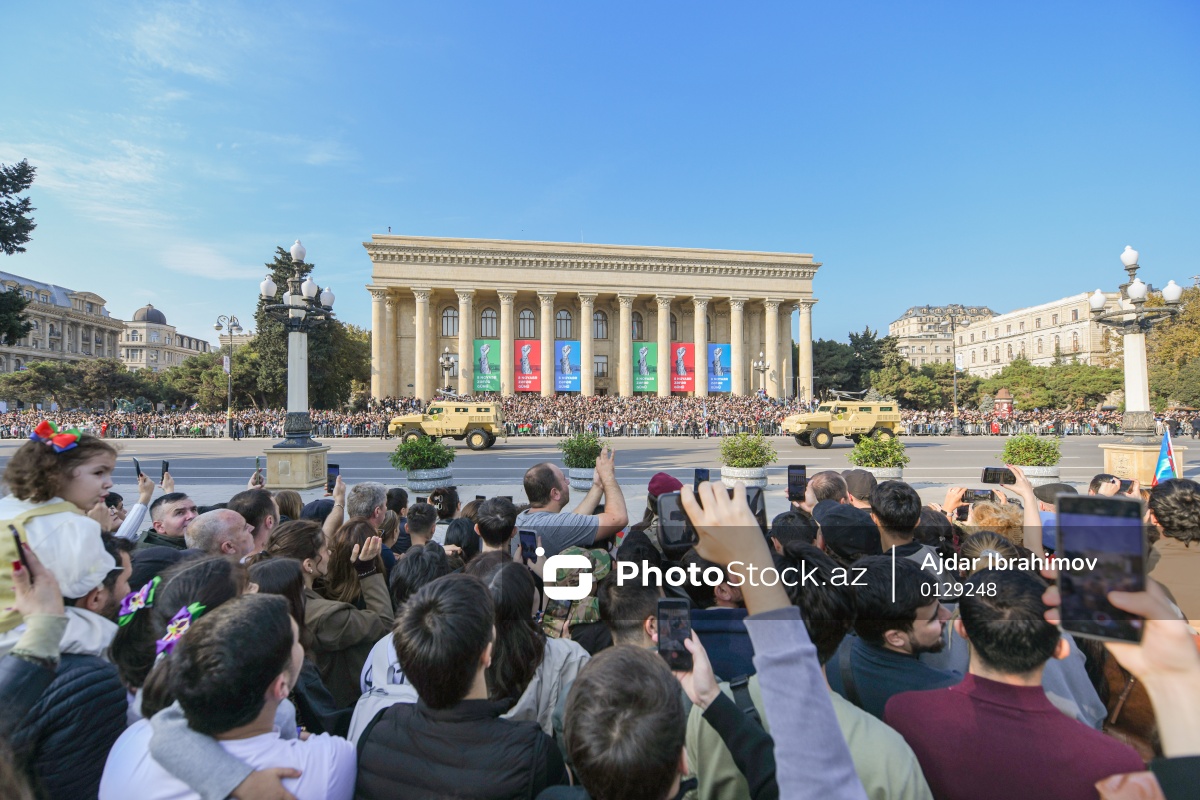 Noyabrın 8-də Bakının Azadlıq meydanında Vətən müharibəsində qələbənin beşinci ildönümünə həsr olunmuş hərbi parad keçirilib. Azərbaycan Respublikasının Prezidenti İlham Əliyev, birinci xanım Mehriban Əliyeva, Türkiyə Respublikasının Prezidenti Rəcəb Tayyib Ərdoğan, Pakistan İslam Respublikasının Baş naziri Məhəmməd Şahbaz Şərif paradda iştirak ediblər. Azərbaycanın, Türkiyənin və Pakistanın Dövlət himnləri səsləndirilib. Ümummilli Lider Heydər Əliyevin və qəhrəman şəhidlərimizin xatirəsi 1 dəqiqəlik sükutla yad olunub. Müdafiə naziri general-polkovnik Zakir Həsənov Azərbaycan Prezidenti, Silahlı Qüvvələrin Müzəffər Ali Baş Komandanı İlham Əliyevə raport verib. Paradda Azərbaycan Respublikasının Prezidenti İlham Əliyev, Türkiyə Respublikasının Prezidenti Rəcəb Tayyib Ərdoğan və Pakistan İslam Respublikasının Baş naziri Məhəmməd Şahbaz Şərif çıxış edib. Daha sonra Silahlı Qüvvələrin şəxsi heyətinin və hərbi texnikanın təntənəli keçidi başlayıb. Hərbi Dəniz Qüvvələrinin və Dövlət Sərhəd Xidməti Sahil Mühafizəsinin döyüş gəmiləri və katerləri Xəzər dənizinin sahil sularında yüksək döyüş hazırlığı nümayiş etdirib. Bundan sonra Azadlıq meydanı üzərində Azərbaycan və Türkiyə pilotlarının iştirakı ilə Hərbi Hava Qüvvələrinə məxsus döyüş təyyarələrinin və helikopterlərin uçuşu olub.