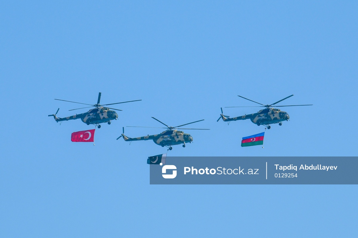 Bakıda keçirilən hərbi paradda nümayiş olunan "Mi-17" helikopteri.