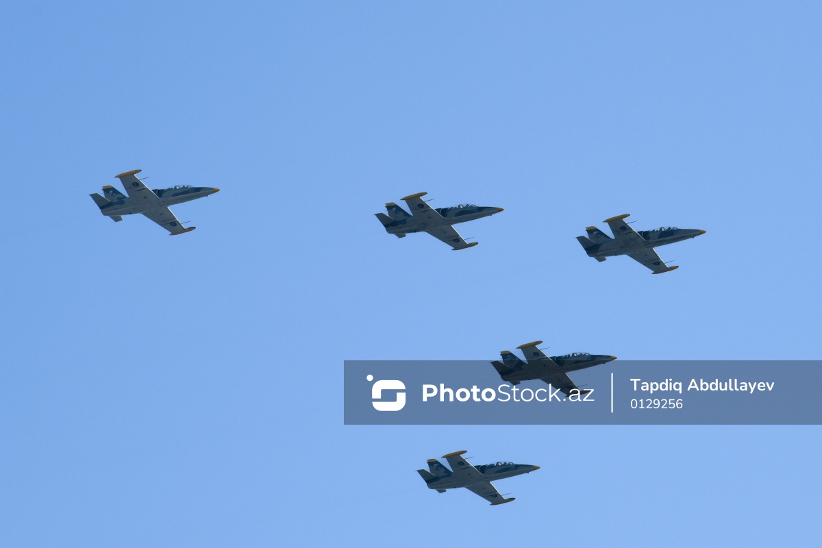 Bakıda keçirilən hərbi paradda nümayiş olunan "L-39" təlim təyyarəsi.