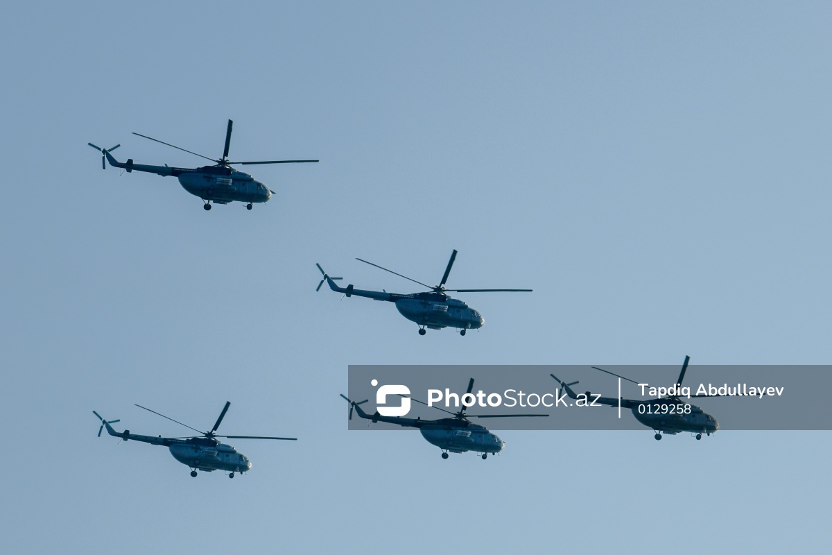 Bakıda keçirilən hərbi paradda nümayiş olunan "Mi-17" helikopteri.