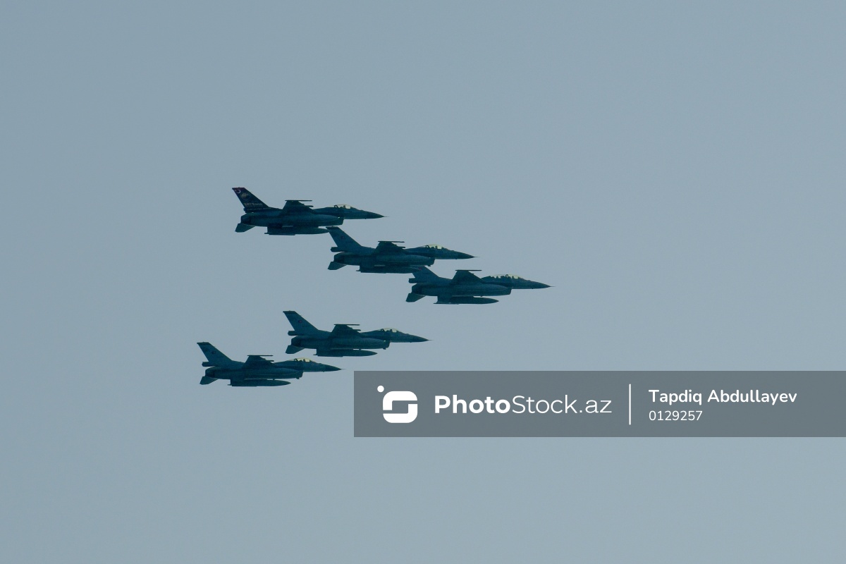 Bakıda keçirilən hərbi paradda nümayiş olunan "JF-17" qırıcı təyyarəsi.