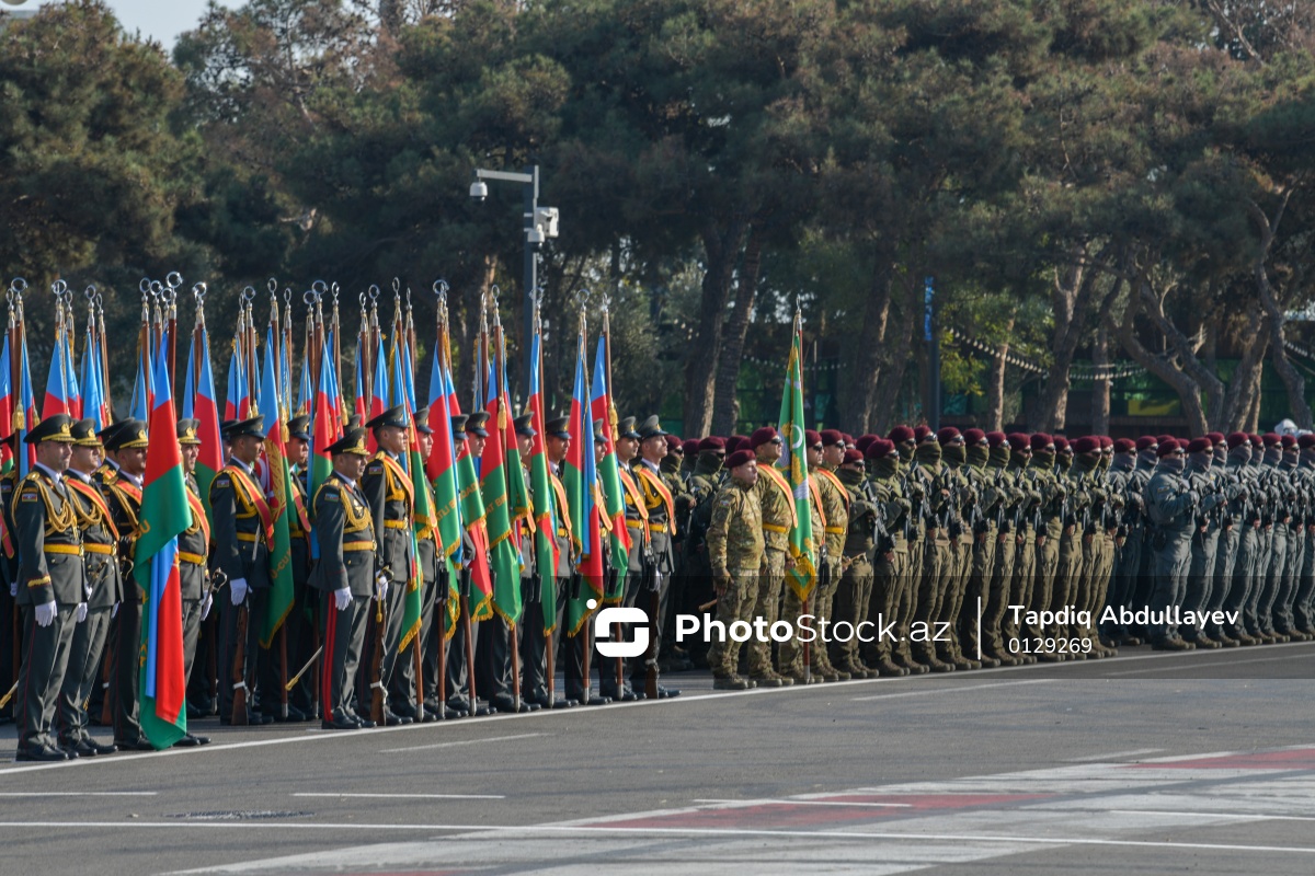 Noyabrın 8-də Bakının Azadlıq meydanında Vətən müharibəsində qələbənin beşinci ildönümünə həsr olunmuş hərbi parad keçirilib. Azərbaycan Respublikasının Prezidenti İlham Əliyev, birinci xanım Mehriban Əliyeva, Türkiyə Respublikasının Prezidenti Rəcəb Tayyib Ərdoğan, Pakistan İslam Respublikasının Baş naziri Məhəmməd Şahbaz Şərif paradda iştirak ediblər. Azərbaycanın, Türkiyənin və Pakistanın Dövlət himnləri səsləndirilib. Ümummilli Lider Heydər Əliyevin və qəhrəman şəhidlərimizin xatirəsi 1 dəqiqəlik sükutla yad olunub. Müdafiə naziri general-polkovnik Zakir Həsənov Azərbaycan Prezidenti, Silahlı Qüvvələrin Müzəffər Ali Baş Komandanı İlham Əliyevə raport verib. Paradda Azərbaycan Respublikasının Prezidenti İlham Əliyev, Türkiyə Respublikasının Prezidenti Rəcəb Tayyib Ərdoğan və Pakistan İslam Respublikasının Baş naziri Məhəmməd Şahbaz Şərif çıxış edib. Daha sonra Silahlı Qüvvələrin şəxsi heyətinin və hərbi texnikanın təntənəli keçidi başlayıb. Hərbi Dəniz Qüvvələrinin və Dövlət Sərhəd Xidməti Sahil Mühafizəsinin döyüş gəmiləri və katerləri Xəzər dənizinin sahil sularında yüksək döyüş hazırlığı nümayiş etdirib. Bundan sonra Azadlıq meydanı üzərində Azərbaycan və Türkiyə pilotlarının iştirakı ilə Hərbi Hava Qüvvələrinə məxsus döyüş təyyarələrinin və helikopterlərin uçuşu olub.