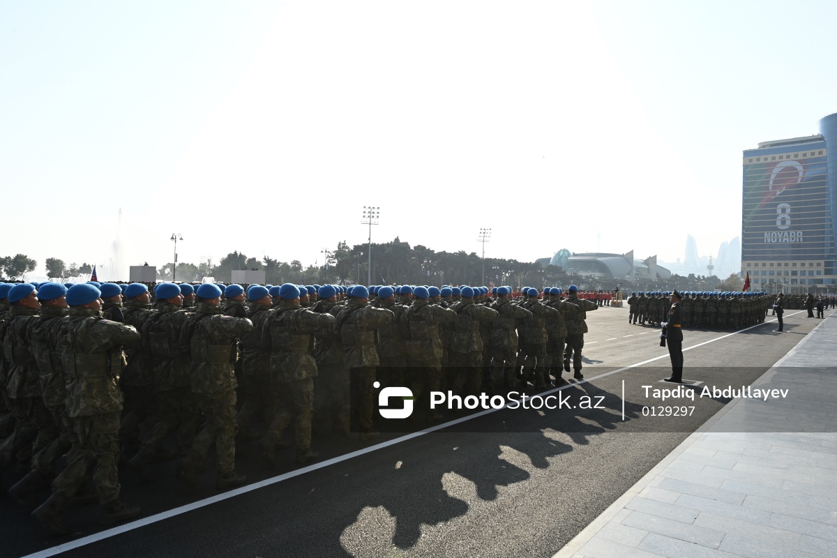 Noyabrın 8-də Bakının Azadlıq meydanında Vətən müharibəsində qələbənin beşinci ildönümünə həsr olunmuş hərbi parad keçirilib. Azərbaycan Respublikasının Prezidenti İlham Əliyev, birinci xanım Mehriban Əliyeva, Türkiyə Respublikasının Prezidenti Rəcəb Tayyib Ərdoğan, Pakistan İslam Respublikasının Baş naziri Məhəmməd Şahbaz Şərif paradda iştirak ediblər. Azərbaycanın, Türkiyənin və Pakistanın Dövlət himnləri səsləndirilib. Ümummilli Lider Heydər Əliyevin və qəhrəman şəhidlərimizin xatirəsi 1 dəqiqəlik sükutla yad olunub. Müdafiə naziri general-polkovnik Zakir Həsənov Azərbaycan Prezidenti, Silahlı Qüvvələrin Müzəffər Ali Baş Komandanı İlham Əliyevə raport verib. Paradda Azərbaycan Respublikasının Prezidenti İlham Əliyev, Türkiyə Respublikasının Prezidenti Rəcəb Tayyib Ərdoğan və Pakistan İslam Respublikasının Baş naziri Məhəmməd Şahbaz Şərif çıxış edib. Daha sonra Silahlı Qüvvələrin şəxsi heyətinin və hərbi texnikanın təntənəli keçidi başlayıb. Hərbi Dəniz Qüvvələrinin və Dövlət Sərhəd Xidməti Sahil Mühafizəsinin döyüş gəmiləri və katerləri Xəzər dənizinin sahil sularında yüksək döyüş hazırlığı nümayiş etdirib. Bundan sonra Azadlıq meydanı üzərində Azərbaycan və Türkiyə pilotlarının iştirakı ilə Hərbi Hava Qüvvələrinə məxsus döyüş təyyarələrinin və helikopterlərin uçuşu olub.