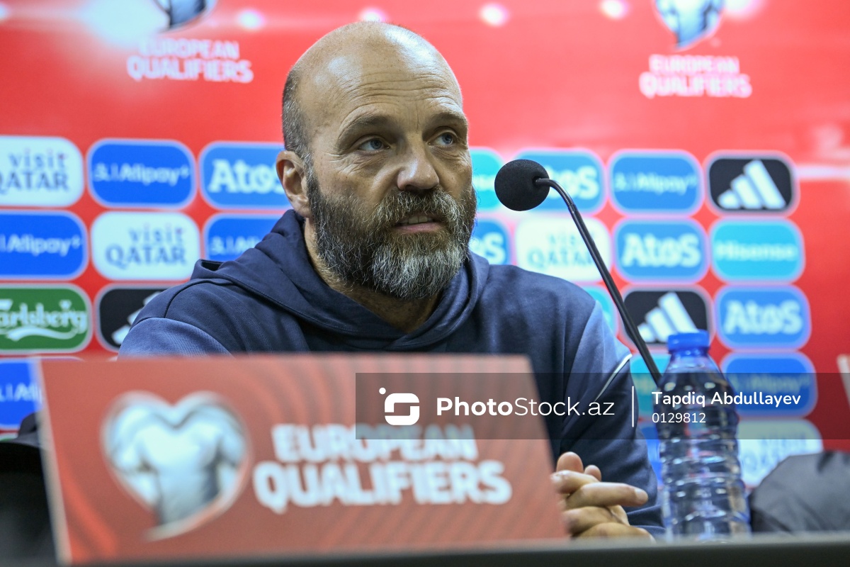 Bakıda keçirilən mətbuat konfransında çıxış edən İslandiya millisinin baş məşqçisi Arnar Qunnlauqsson.