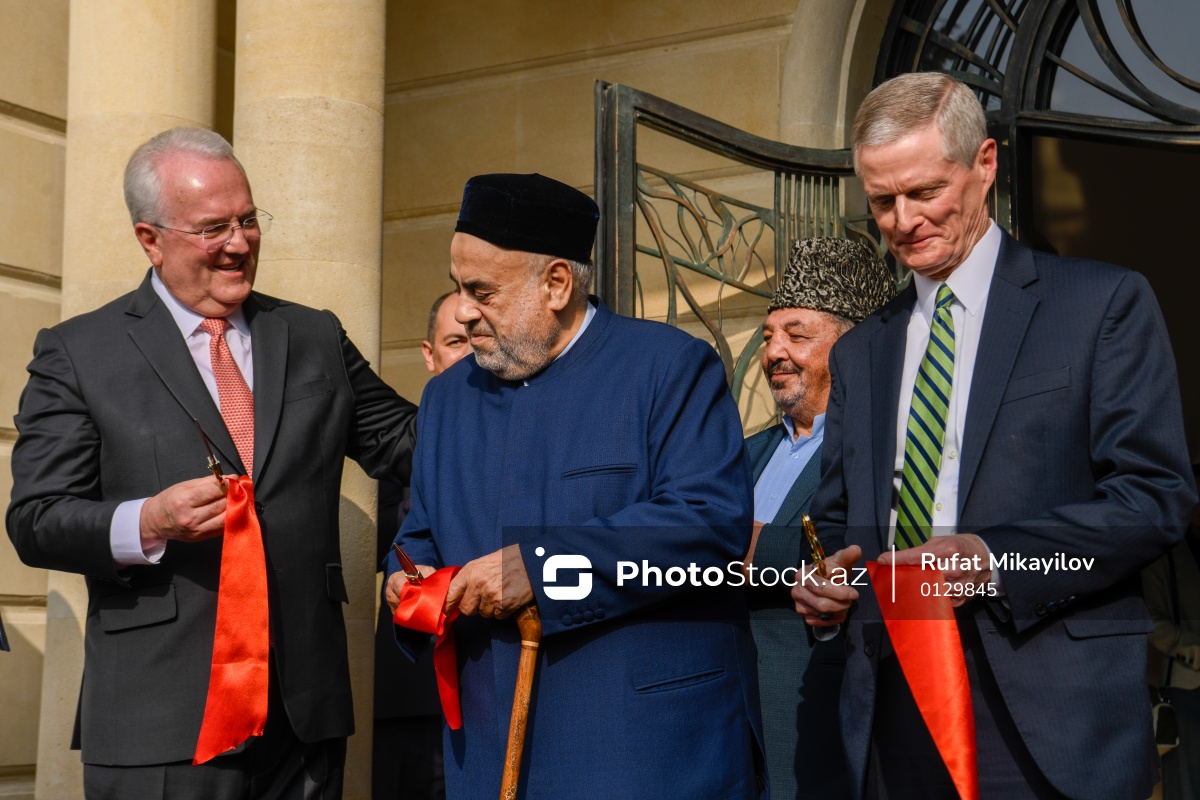 İsa Məsihin Sonuncu Gün Müqəddəsləri Kilsəsinin Bakı ofisinin açılışında iştirak edən (soldan-sağa) Yetmişlər Komitəsinin üzvü və Avropa Mərkəzi Ərazi İdarəsinin birinci məsləhətçisi Cek Gerard, Qafqaz Müsəlmanları İdarəsinin sədri Şeyxülislam Hacı Allahşükür Paşazadə və "On İki Həvari Kvorumu"nun üzvü Deyvid Bednar.