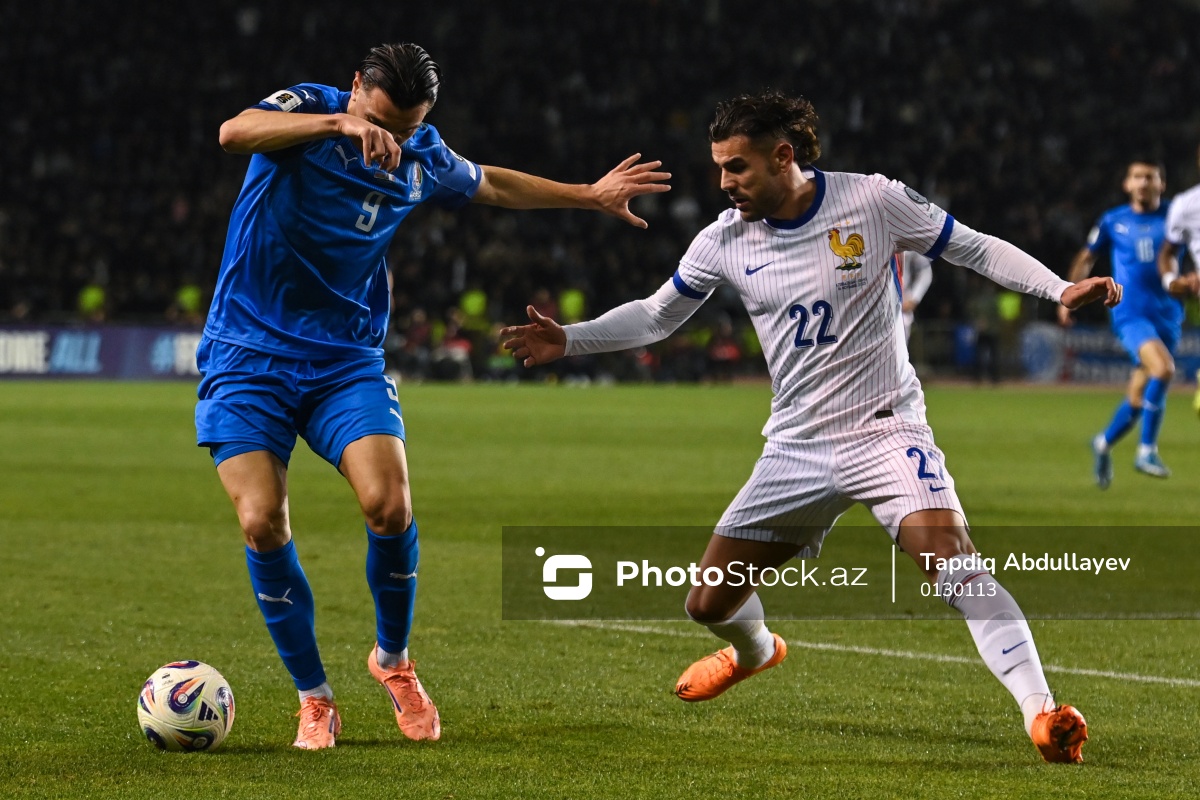 16.11.2025 Tofiq Bəhramov adına Respublika stadionu, DÇ-2026-nın seçmə mərhələsində Azərbaycan – Fransa oyununda Azərbaycan millisinin oyunçusu Renat Dadaşov (solda) və Fransa millisinin oyunçusu Teo Ernandes (sağda) mübarizəsi.