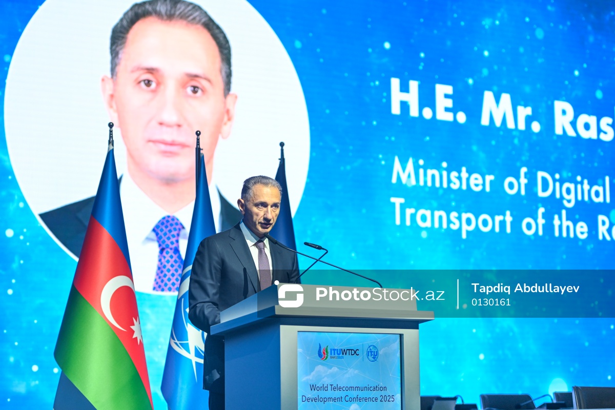Ümumdünya Telekommunikasiyanın İnkişafı Konfransında (WTDC-2025) çıxış edən Azərbaycan Respublikasının rəqəmsal inkişaf və nəqliyyat naziri Rəşad Nəbiyev.