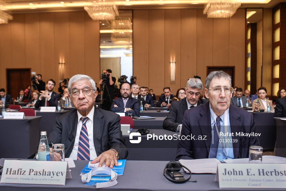Azərbaycan-ABŞ Beyin Mərkəzlərinin Birinci Forumunda iştirak edən ADA Universitetinin rektoru Hafiz Paşayev (sol) və Atlantik Şurasının Avrasiya Mərkəzinin baş direktoru Con Herbst (sağ).