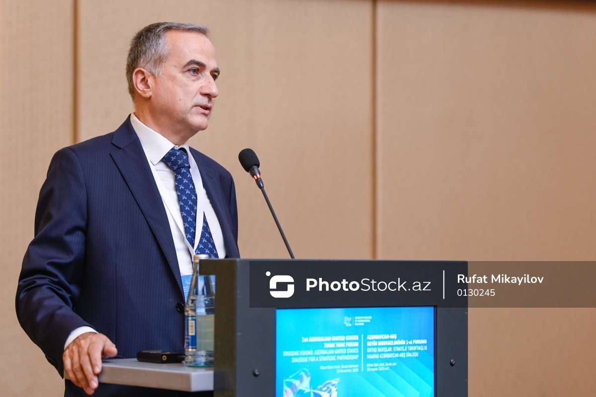 Azərbaycan-ABŞ Beyin Mərkəzlərinin Birinci Forumunda çıxış edən Beynəlxalq Münasibətlərin Təhlili Mərkəzinin (BMTM) idarə heyətinin sədri Fərid Şəfiyev.