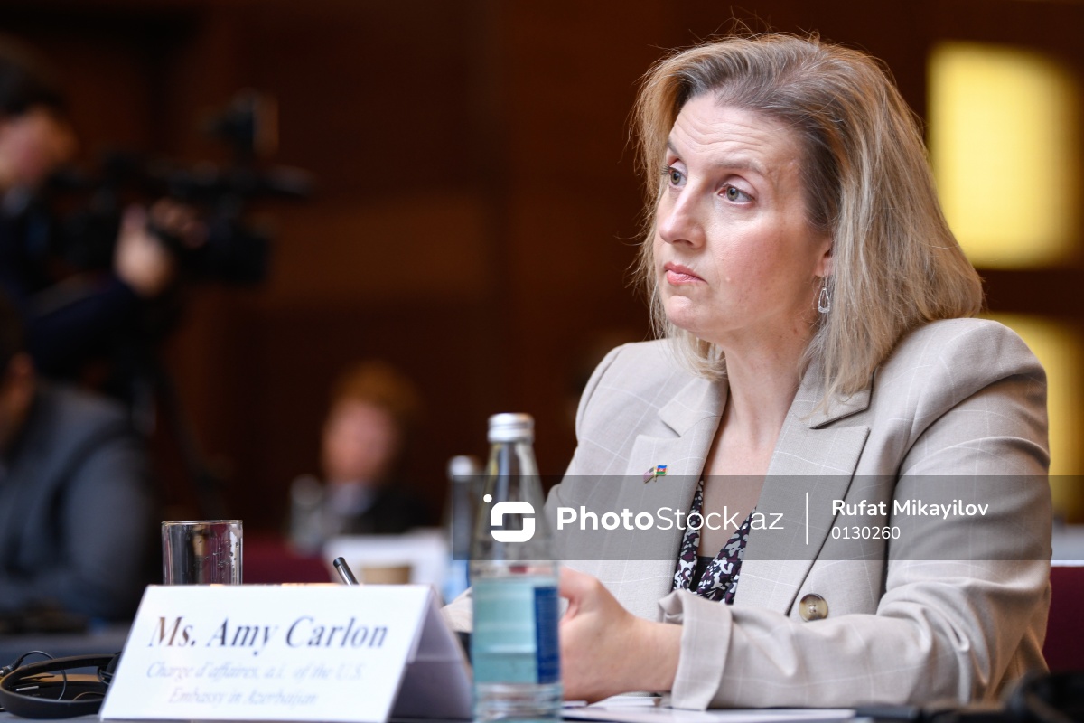 Azərbaycan-ABŞ Beyin Mərkəzlərinin Birinci Forumunda iştirak edən ABŞ-nin Bakıdakı müvəqqəti işlər vəkili Emi Karlon.