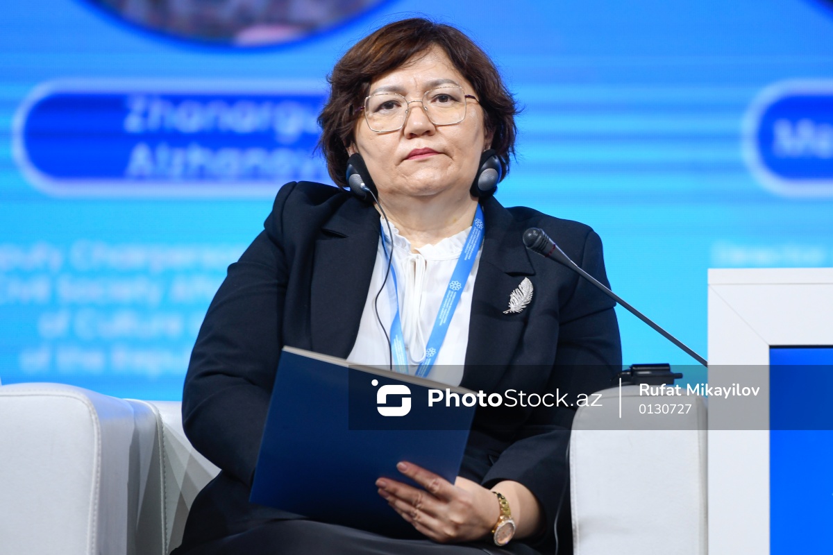 Türk Dövlətləri Təşkilatına (TDT) üzv ölkələrin QHT-lərinin Həmrəylik Forumunda iştirak edən Qazaxıstanın İnformasiya və Mədəniyyət Nazirliyinin Vətəndaş Cəmiyyəti Məsələləri Komitəsinin sədr müavini Janargul Aljanova.