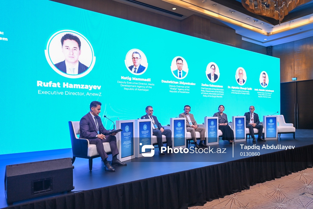 Türk Dövlətləri Təşkilatının Media Forumu çərçivəsində “Müasir dövrdə artan qlobal informasiya təhdidlərinə qarşı dayanıqlı və preventiv addımlar: Türk dövlətlərinin media ekosistemi nümunəsində” mövzusuna həsr olunmuş panel sessiyasında iştirak edən (soldan-sağa) “AnewZ” televiziya kanalının icraçı direktoru Rüfət Həmzəyev, Medianın İnkişafı Agentliyinin İcraçı direktorunun müavini Natiq Məmmədli, Qazaxıstan Respublikasının “Xabar” Agentliyinin sədrinin müavini Dauletxan Jiyenkulov, Qırğızıstan Respublikasının Mədəniyyət, İnformasiya və Gənclər Siyasəti Nazirliyinin İnformasiya siyasəti departamentinin baş mütəxəssisi Zarina Kalmuratova, Türkiyənin ölkəmizdəki səfirliyinin mətbuat müşaviri Alptekin Cihangir İşbilir.
