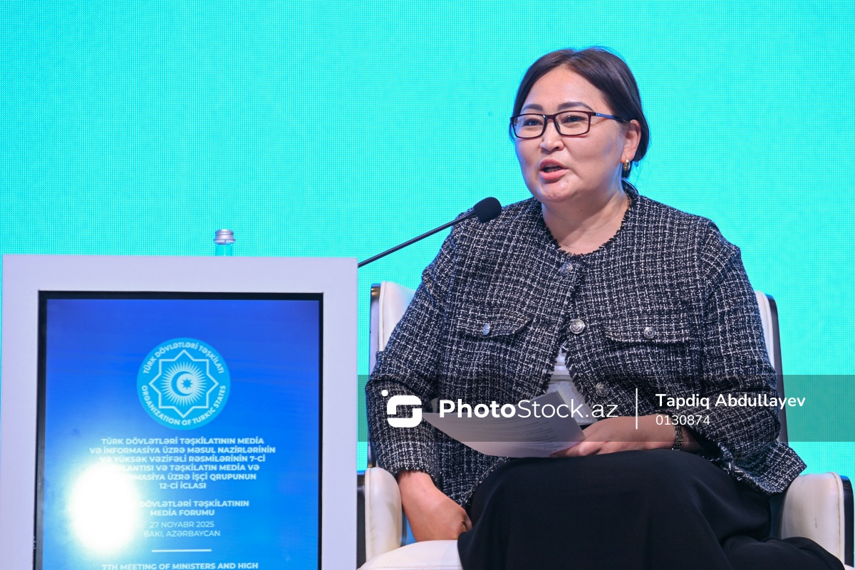 Türk Dövlətləri Təşkilatının Media Forumu çərçivəsində “Müasir dövrdə artan qlobal informasiya təhdidlərinə qarşı dayanıqlı və preventiv addımlar: Türk dövlətlərinin media ekosistemi nümunəsində” mövzusuna həsr olunmuş panel sessiyasında iştirak edən Qırğızıstan Respublikasının Mədəniyyət, İnformasiya və Gənclər Siyasəti Nazirliyinin İnformasiya siyasəti departamentinin baş mütəxəssisi Zarina Kalmuratova.