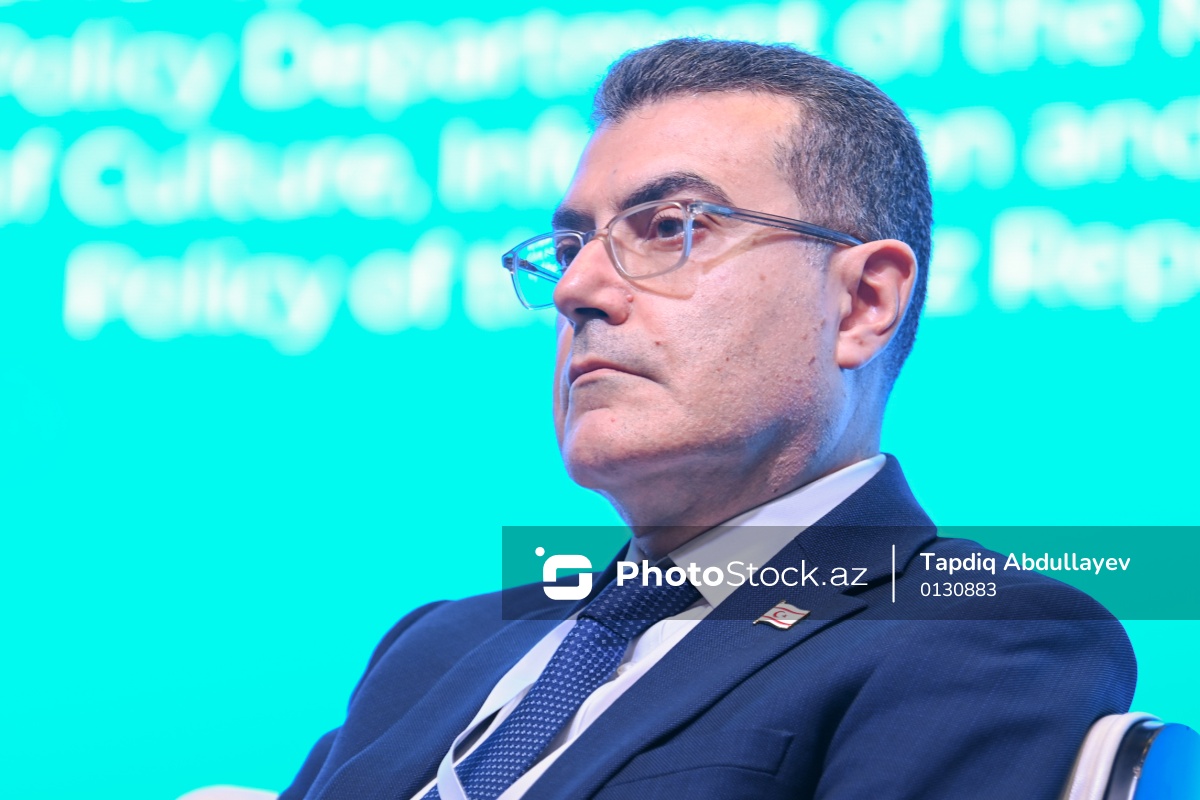 Türk Dövlətləri Təşkilatının Media Forumu çərçivəsində “Müasir dövrdə artan qlobal informasiya təhdidlərinə qarşı dayanıqlı və preventiv addımlar: Türk dövlətlərinin media ekosistemi nümunəsində” mövzusuna həsr olunmuş panel sessiyasında iştirak edən Şimali Kipr Türk Cümhuriyyətinin xarici işlər nazirinin müavini Mustafa Lakadamyalı.