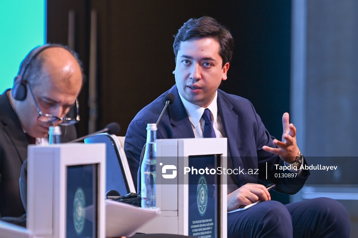 Türk Dövlətləri Təşkilatının Media Forumu çərçivəsində "Rəqəmsal media mühitində TDT-yə üzv dövlətlərin qarşılıqlı əməkdaşlıq imkanları" mövzusuna həsr olunmuş panel sessiyasında iştirak edən Özbəkistan Respublikası Prezidentinin Administrasiyası yanında Kütləvi İnformasiya Vasitələri üçün Məzmunun İstehsalı Mərkəzinin departament rəhbəri Tohir Umarov.