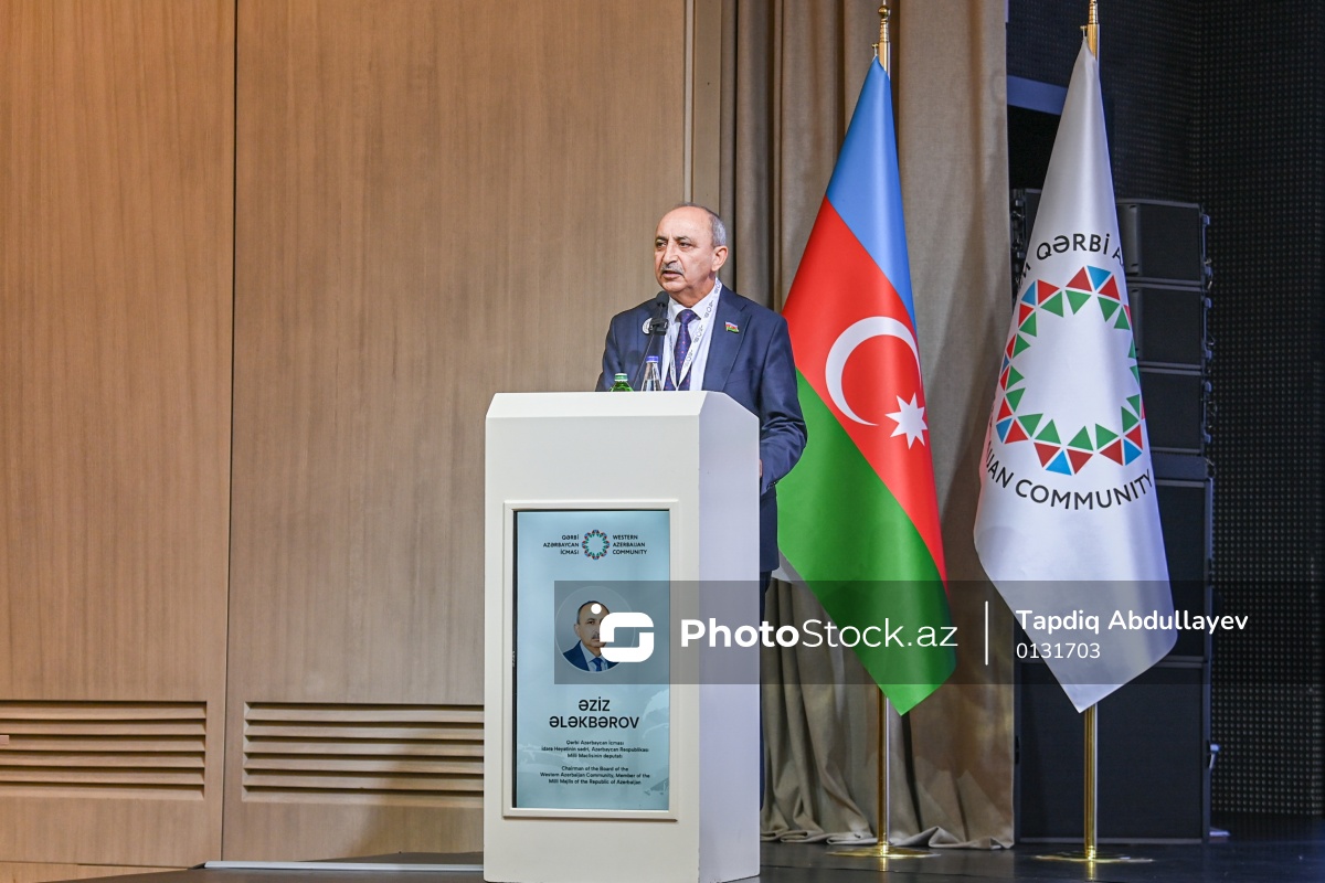 "Mədəni irs və qayıdış hüququ: Ermənistandan didərgin salınmış azərbaycanlıların mədəni irsinin bərpası - ədalətə, barışığa və sülhə aparan yol kimi" mövzusunda III beynəlxalq konfransda çıxış edən Qərbi Azərbaycan İcması İdarə Heyətinin sədri, Milli Məclisin deputatı Əziz Ələkbərov.