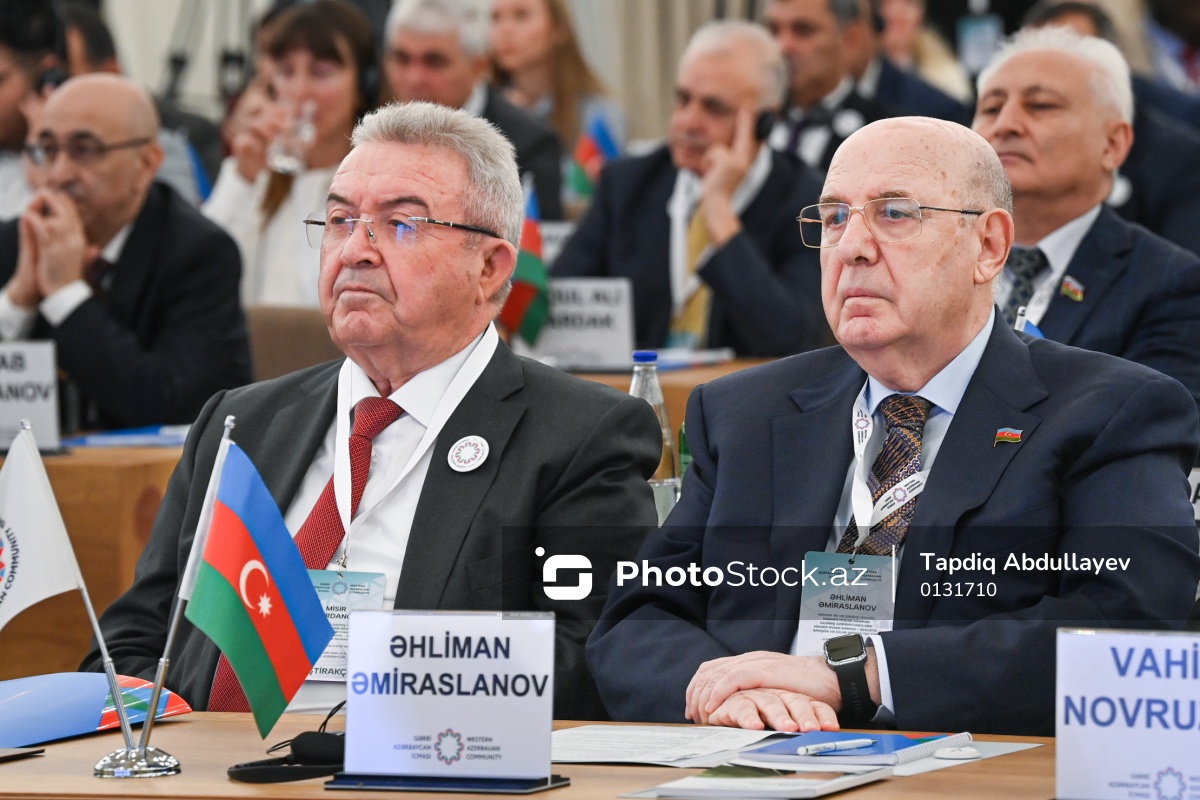 "Mədəni irs və qayıdış hüququ: Ermənistandan didərgin salınmış azərbaycanlıların mədəni irsinin bərpası - ədalətə, barışığa və sülhə aparan yol kimi" mövzusunda III beynəlxalq konfransda iştirak edən Qərbi Azərbaycan İcması Müşahidə Şurasının sədri, AMEA-nın müxbir üzvü Misir Mərdanov (sol) və Qərbi Azərbaycan İcması Ağsaqqallar Şurasının sədri Əhliman Əmiraslanov (sağ).