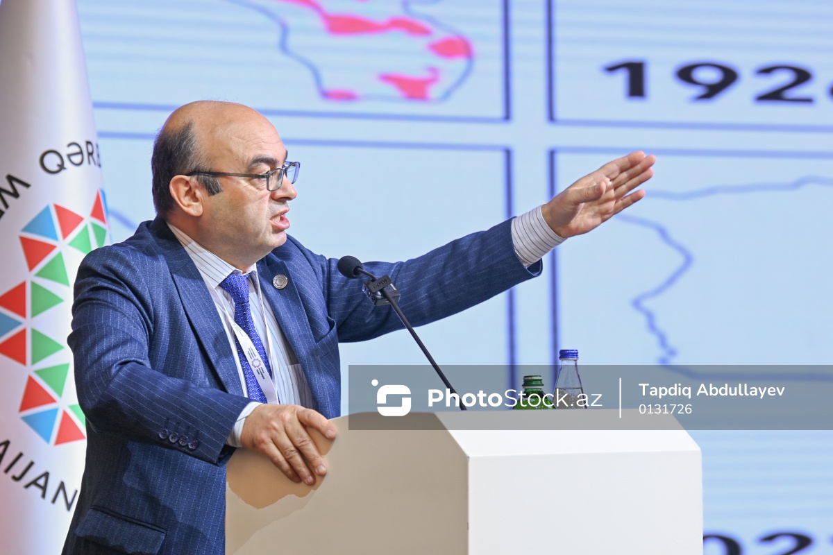 "Mədəni irs və qayıdış hüququ: Ermənistandan didərgin salınmış azərbaycanlıların mədəni irsinin bərpası - ədalətə, barışığa və sülhə aparan yol kimi" mövzusunda III beynəlxalq konfransda çıxış edən Türkiyənin Heydər Əliyev adına Avrasiya Araşdırmalar Mərkəzinin direktoru, professor Yaşar Sarı.