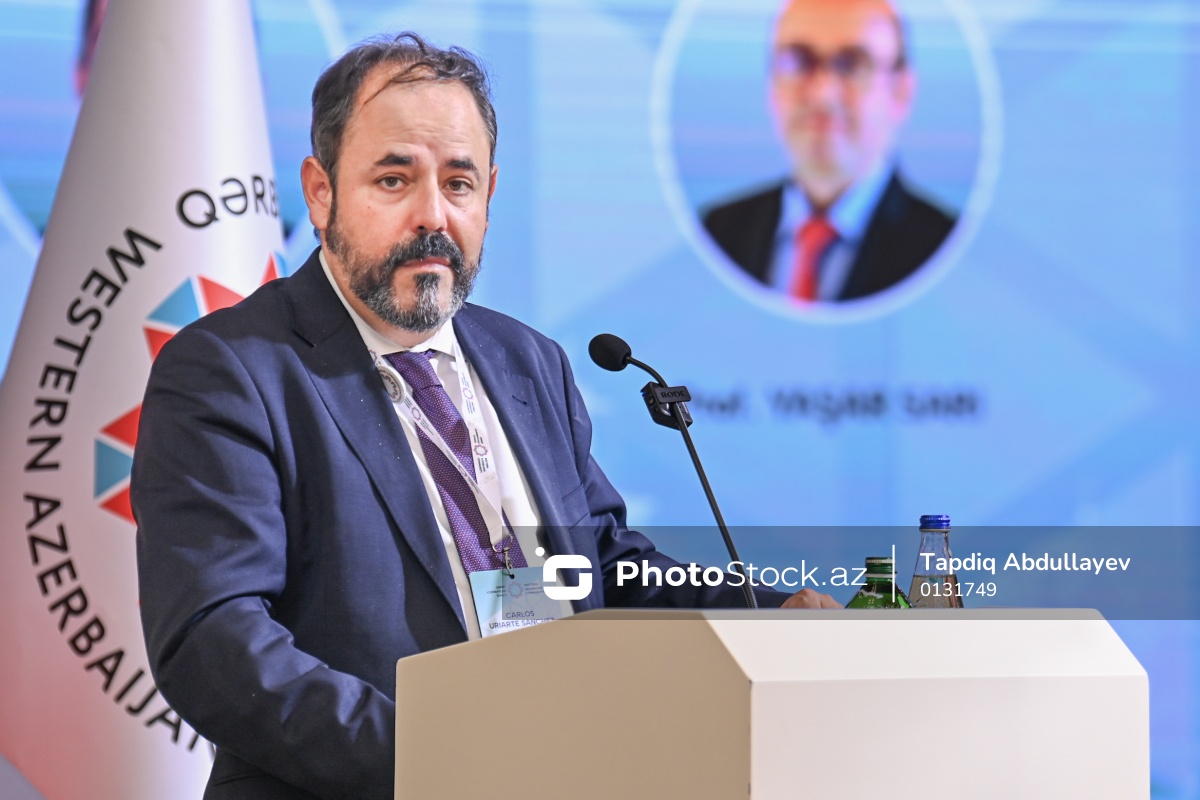 "Mədəni irs və qayıdış hüququ: Ermənistandan didərgin salınmış azərbaycanlıların mədəni irsinin bərpası - ədalətə, barışığa və sülhə aparan yol kimi" mövzusunda III beynəlxalq konfransda iştirak edən İspaniyanın Beynəlxalq Paneuropean İttifaqının Baş katibi, professor Karlos Uriarte Sançez.
