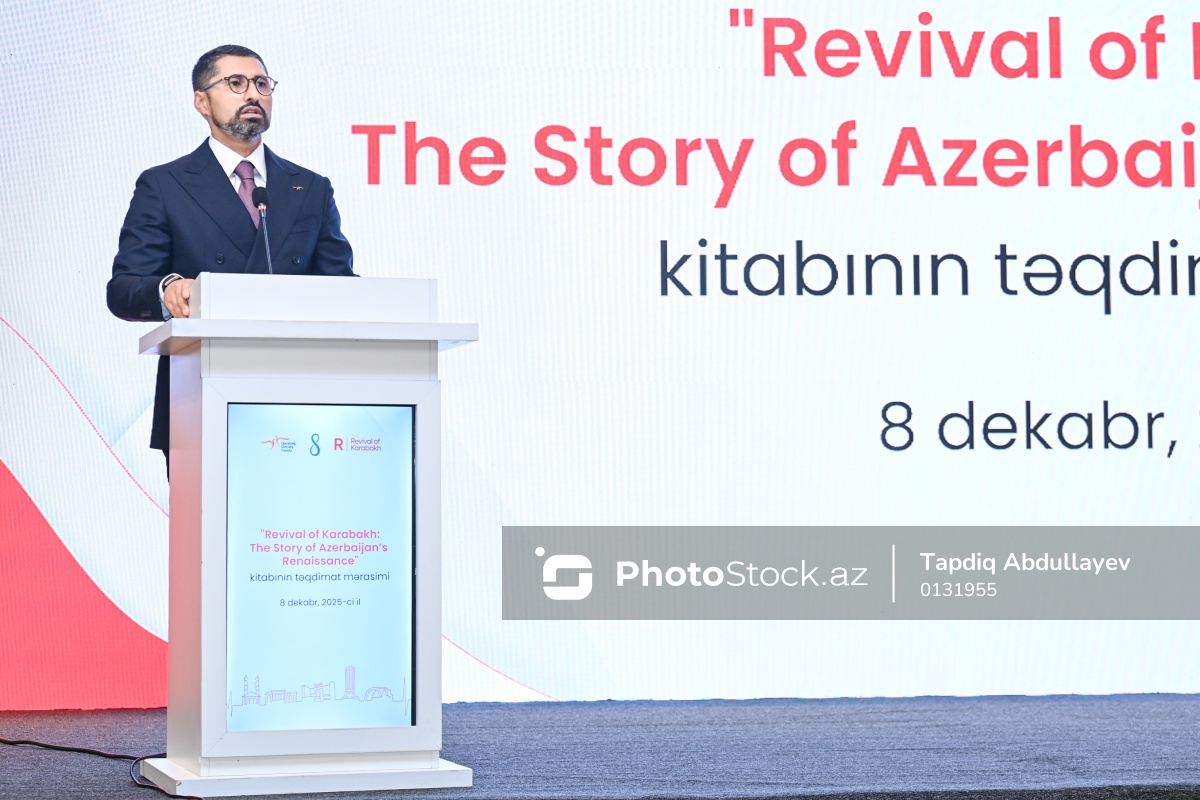 "Qarabağın dirçəlişi: Azərbaycan intibahının hekayəsi" kitabının təqdimat mərasimində çıxış edən Qarabağ Dirçəliş Fondunun sədri Rəhman Hacıyev.