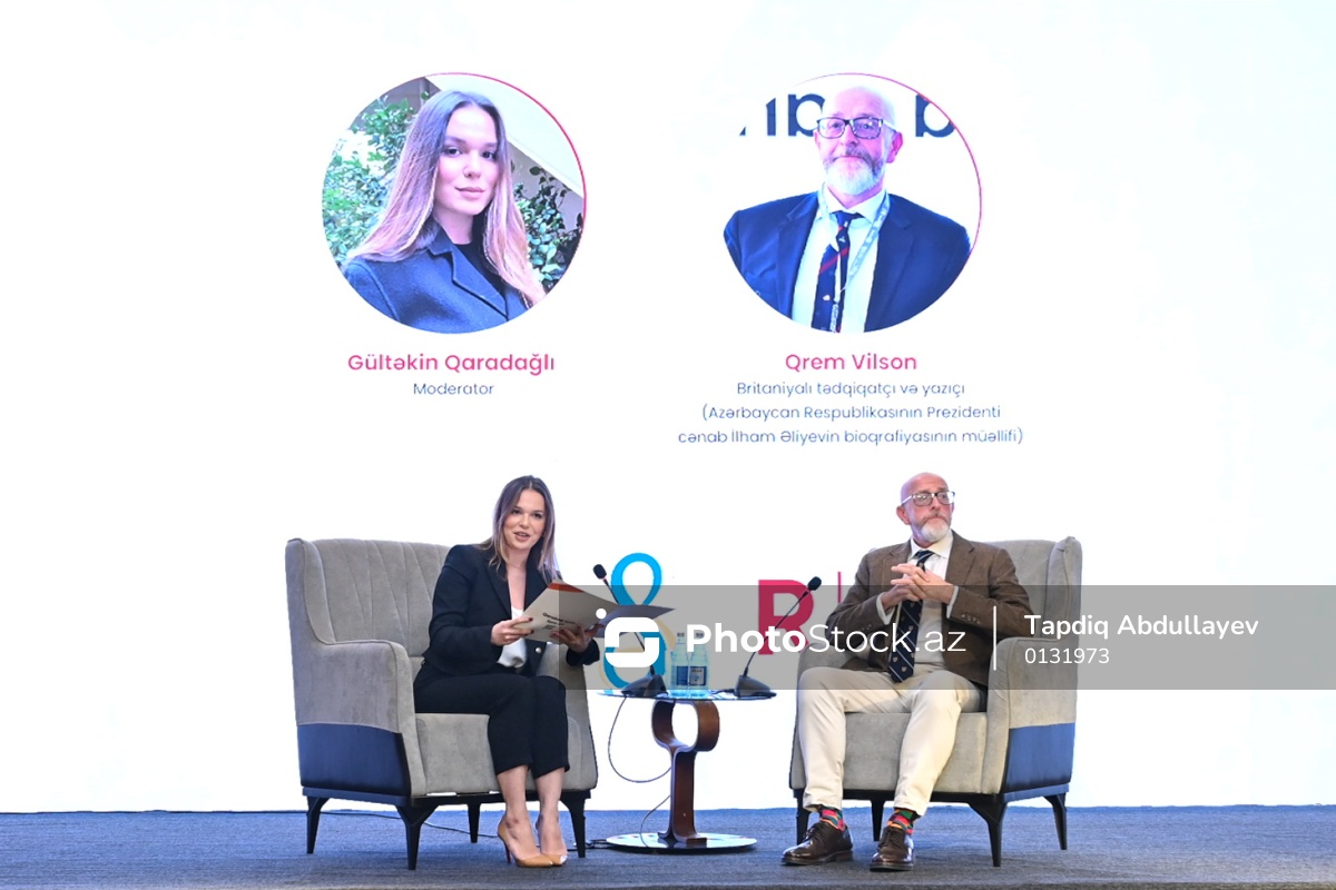 "Qarabağın dirçəlişi: Azərbaycan intibahının hekayəsi" kitabının təqdimat mərasimində panel sessiyanın moderatoru Gültəkin Qaradağlı (sol), Böyük Britaniyalı tədqiqatçı və yazıçı Qrem Vilson (sağ).