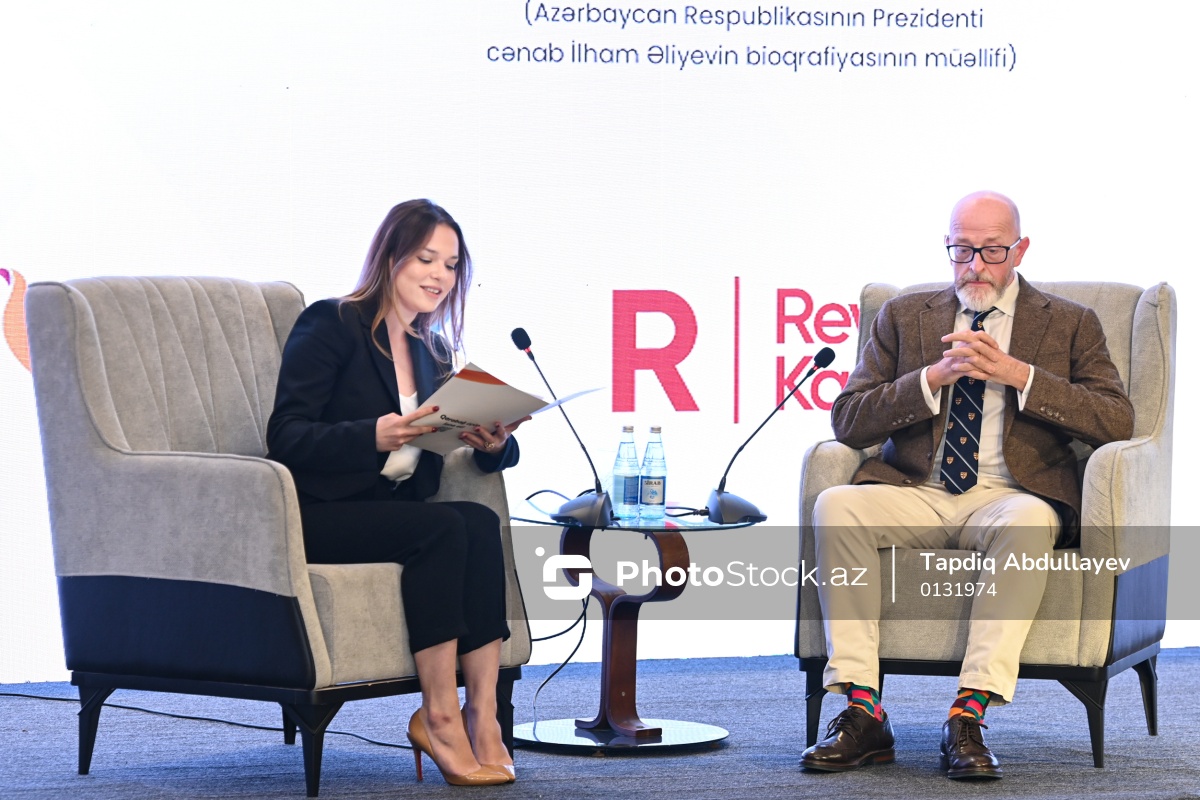 "Qarabağın dirçəlişi: Azərbaycan intibahının hekayəsi" kitabının təqdimat mərasimində panel sessiyanın moderatoru Gültəkin Qaradağlı (sol), Böyük Britaniyalı tədqiqatçı və yazıçı Qrem Vilson (sağ).