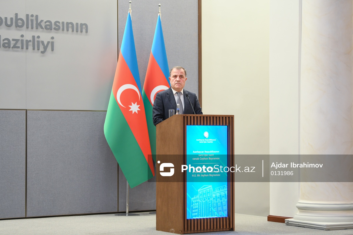 Dekabrın 8-i Azərbaycan Respublikasının Xarici İşlər Nazirliyində keçirilən mətbuat konfransında çıxış edən xarici işlər naziri Ceyhun Bayramov.