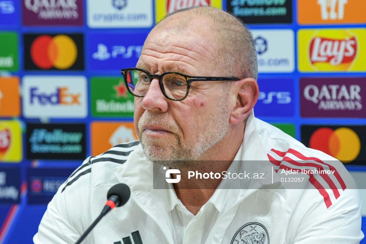 “Ayaks”ın UEFA Çempionlar Liqasının liqa mərhələsinin VI turunda “Qarabağ” ilə keçirəcəyi oyunundan öncə mətbuat konfransında çıxış edən komandanın baş məşqçi səlahiyyətlərini icra edən Fred Qrim.
