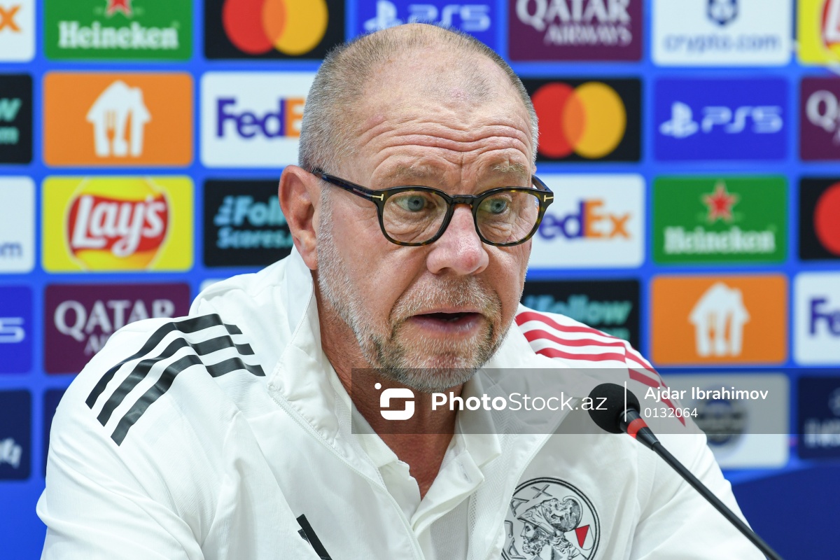 “Ayaks”ın UEFA Çempionlar Liqasının liqa mərhələsinin VI turunda “Qarabağ” ilə keçirəcəyi oyunundan öncə mətbuat konfransında çıxış edən komandanın baş məşqçi səlahiyyətlərini icra edən Fred Qrim.