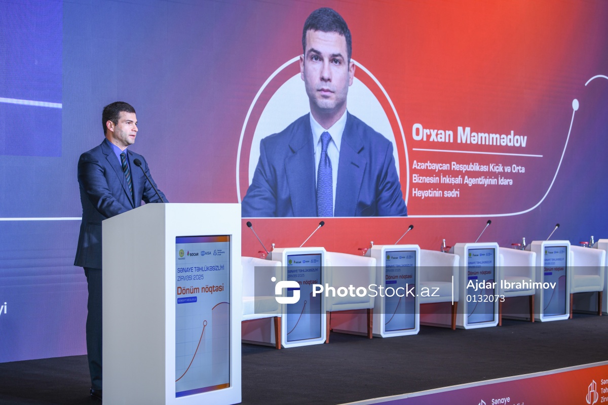 "Sənaye Təhlükəsizliyi Zirvəsi 2025" adlı tədbirdə çıxış edən İqtisadiyyat Nazirliyi yanında Kiçik və Orta Biznesin İnkişafı Agentliyi İdarə Heyətinin sədri Orxan Məmmədov.