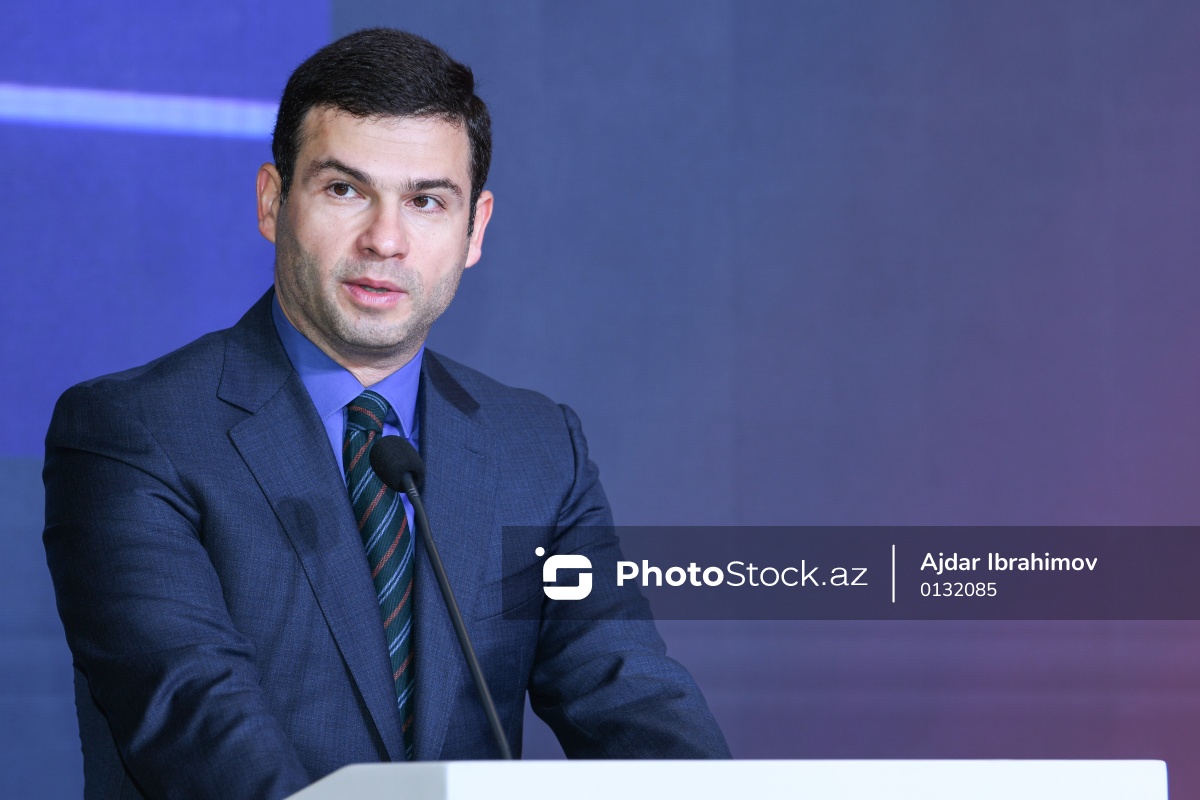 "Sənaye Təhlükəsizliyi Zirvəsi 2025" adlı tədbirdə çıxış edən İqtisadiyyat Nazirliyi yanında Kiçik və Orta Biznesin İnkişafı Agentliyi İdarə Heyətinin sədri Orxan Məmmədov.