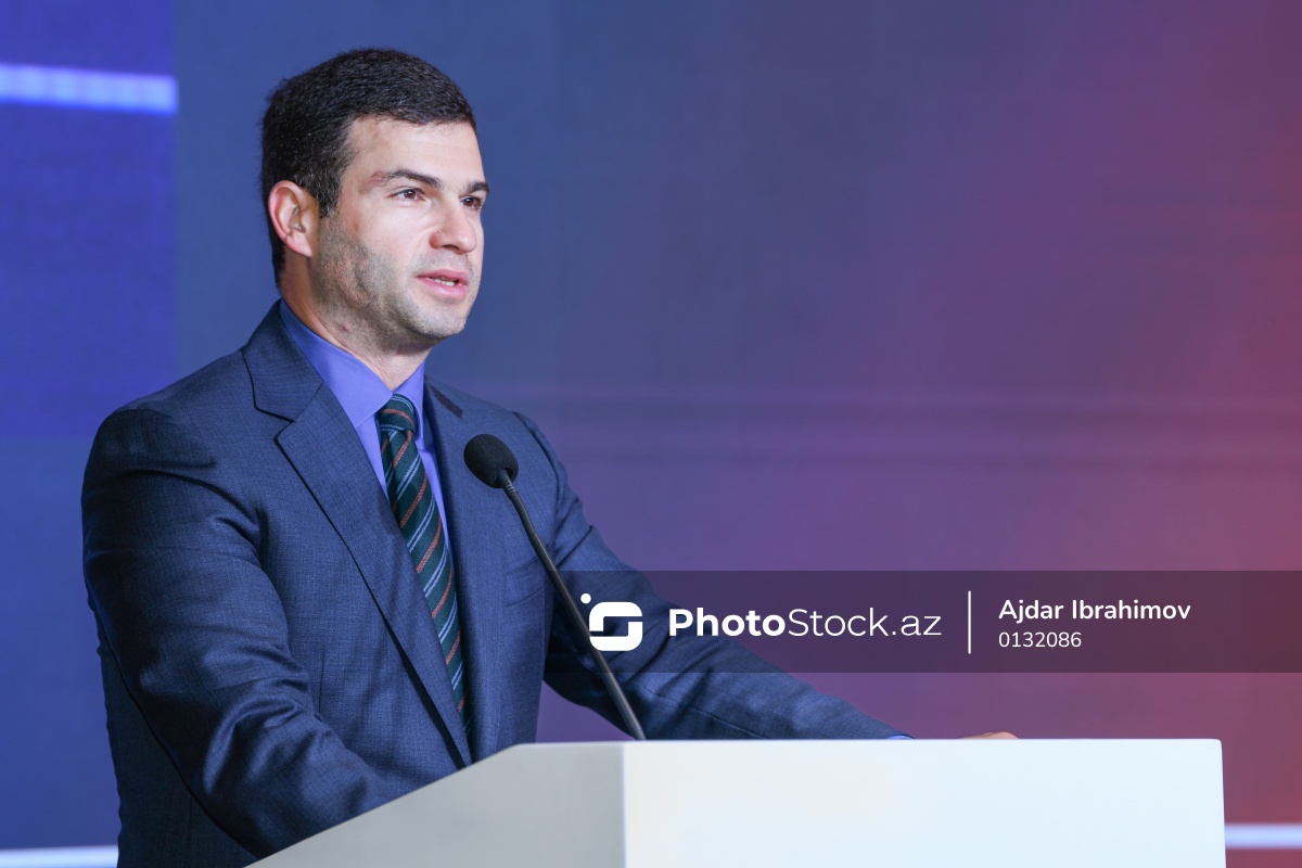 "Sənaye Təhlükəsizliyi Zirvəsi 2025" adlı tədbirdə çıxış edən İqtisadiyyat Nazirliyi yanında Kiçik və Orta Biznesin İnkişafı Agentliyi İdarə Heyətinin sədri Orxan Məmmədov.