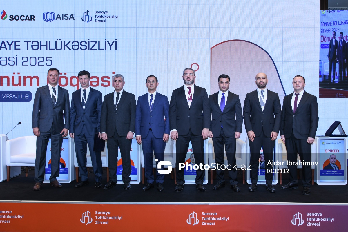 “Sənaye Təhlükəsizliyi Zirvəsi 2025” adlı tədbirdə iştirak edən (soldan-sağa) Azərbaycan Dövlət Neft Şirkətinin (SOCAR) prezidentinin sağlamlıq və əməyin mühafizəsi üzrə müşaviri Məmməd Əlizadə, Beynəlxalq Əmək Təşkilatının (BƏT) Azərbaycan üzrə nümayəndəsi Yaşar Həmzəyev, BP-nin Səngəçal Terminalının SƏTƏMM və Karbon izi üzrə qrup rəhbəri İdrak Nəzərov, Azərbaycan Metrologiya İnstitutunun baş direktoru Xamis Seyranov, "Prime Cotton" MMC-nin baş icraçı direktoru Rövşən Mahmudov, Fövqəladə Hallar Nazirliyi yanında Sənayedə İşlərin Təhlükəsiz Görülməsi və Dağ-Mədən Nəzarəti Dövlət Agentliyinin rəisi Vüsal Ağayev, Azərbaycan Sənaye Təhlükəsizliyi Assosiasiyası İctimai Birliyinin İdarə Heyətinin sədri Orxan Xəlilzadə, "AZCON" Holdinqin SƏTƏMM şöbəsinin müdiri Samir Əliyev.