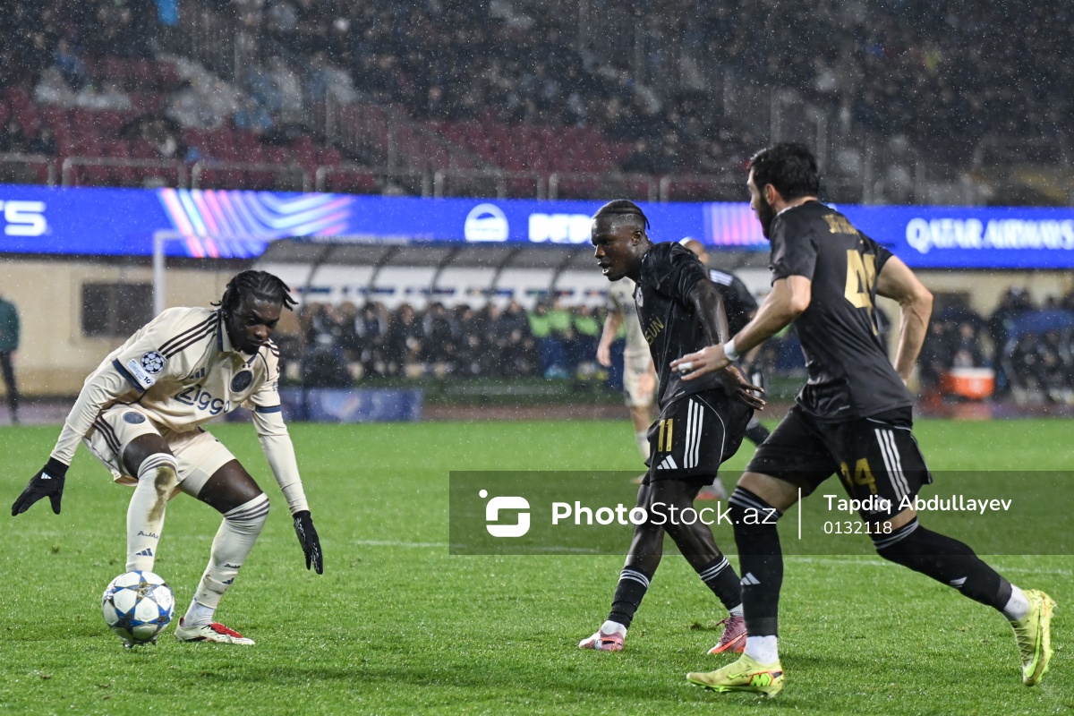 10.12.2025 Tofiq Bəhramov adına Respublika stadionu, UEFA Çempionlar Liqasının “Qarabağ” - "Ayaks" oyununda "Ayaks” komandasının oyunçusu Don-Angelo Konadu (solda) ilə "Qarabağ" komandasının oyunçuları Emmanuel Addai (ortada) və Elvin Cəfərquliyev (sağda) mübarizəsi.