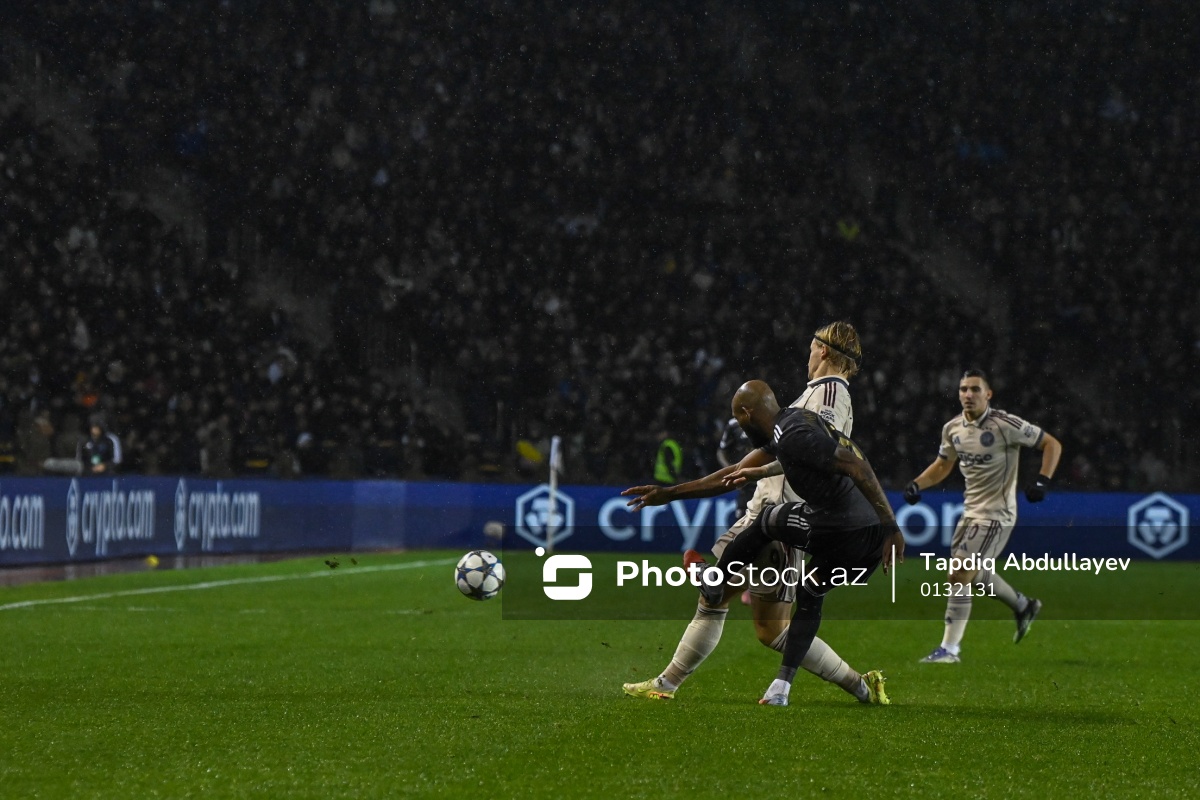 10.12.2025 Tofiq Bəhramov adına Respublika stadionu, UEFA Çempionlar Liqasının “Qarabağ” - "Ayaks" oyununda "Qarabağ” komandasının oyunçusu Kevin Medina (öndə) və "Ayaks” komandasının oyunçusu Kasper Dolberq (arxada) mübarizəsi.