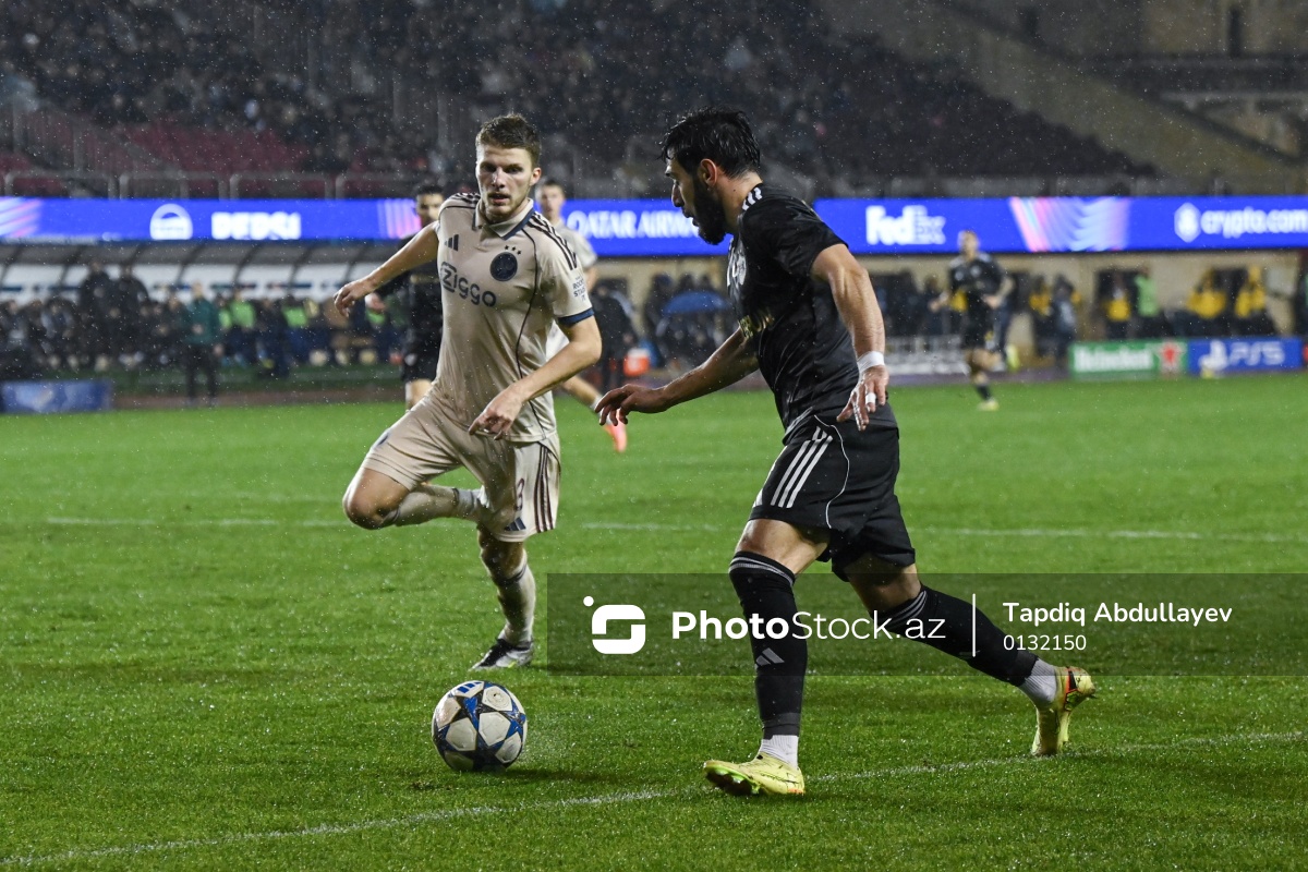 10.12.2025 Tofiq Bəhramov adına Respublika stadionu, UEFA Çempionlar Liqasının “Qarabağ” - "Ayaks" oyununda "Ayaks” komandasının oyunçusu Anton Qoei (solda) və "Qarabağ” komandasının oyunçusu Elvin Cəfərquliyev (sağda) mübarizəsi.
