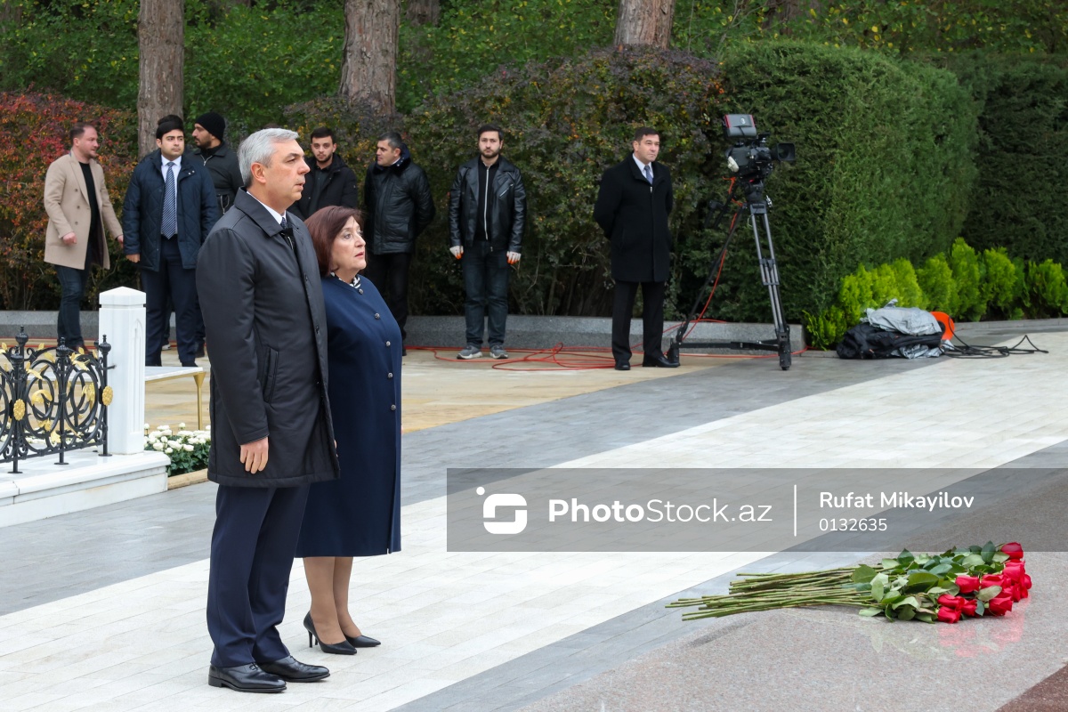 Ulu Öndər Heydər Əliyevin vəfatının 22-ci ildönümü ilə əlaqədar olaraq Fəxri xiyabanı ziyarət edən Prezident Administrasiyasının rəhbəri Samir Nuriyev (sol) və Milli Məclisin sədri Sahibə Qafarova (sağ).