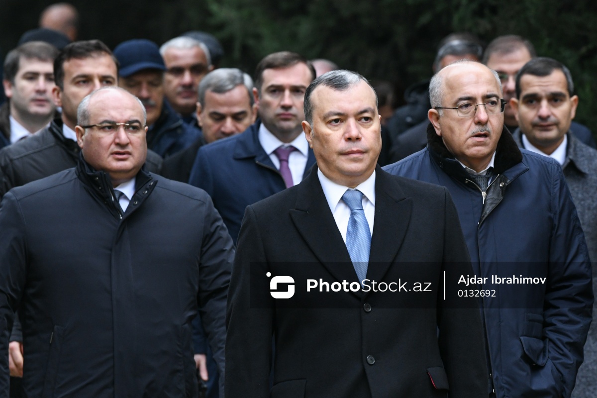 Ulu Öndər Heydər Əliyevin vəfatının 22-ci ildönümü ilə əlaqədar olaraq Fəxri xiyabanı ziyarət edən (soldan-sağa) Azərbaycan Respublikasının maliyyə nazirinin müavini Himalay Məmişov, maliyyə naziri Sahil Babayev və Maliyyə nazirinin müavini Azər Bayramov.